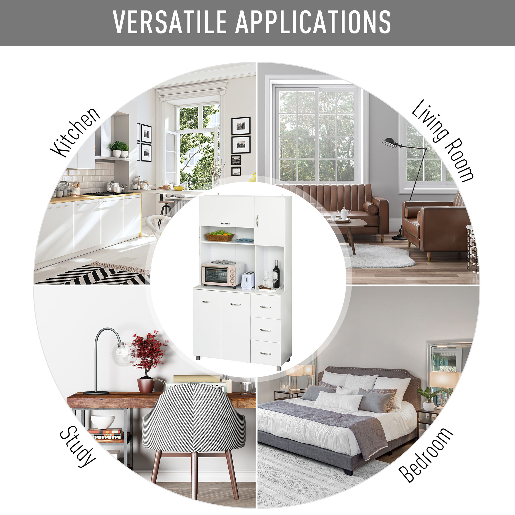 Make the most of your home space with this freestanding kitchen units from HOMCOM. It is made with three open compartments, three drawers, a large bottom cabinet and two top cabinets, giving you plenty of storage and display room for all your kitchen supplies. Using particle board for the structure, the pantry cupboard is tough for everyday use. Each door is fitted with a metal handle for easy opening, with the polished finish adding a sleek look to the overall white finish of the unit.
