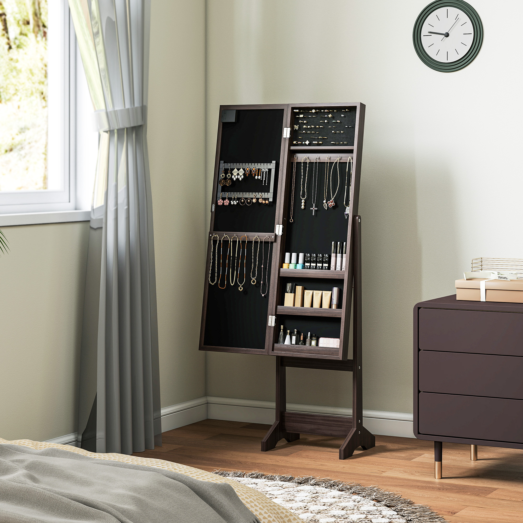 Keep jewellery, makeup and more organised with this HOMCOM freestanding mirror cabinet. It features a longline mirror, surrounding by 16x LED lights - illuminates the mirror so you can ready even in the dark. Open to door to discover 70x ring slots, 32x earring pair slots, 12 hooks and three shelves - plenty of room for keeping all make-up and beauty essentials together.