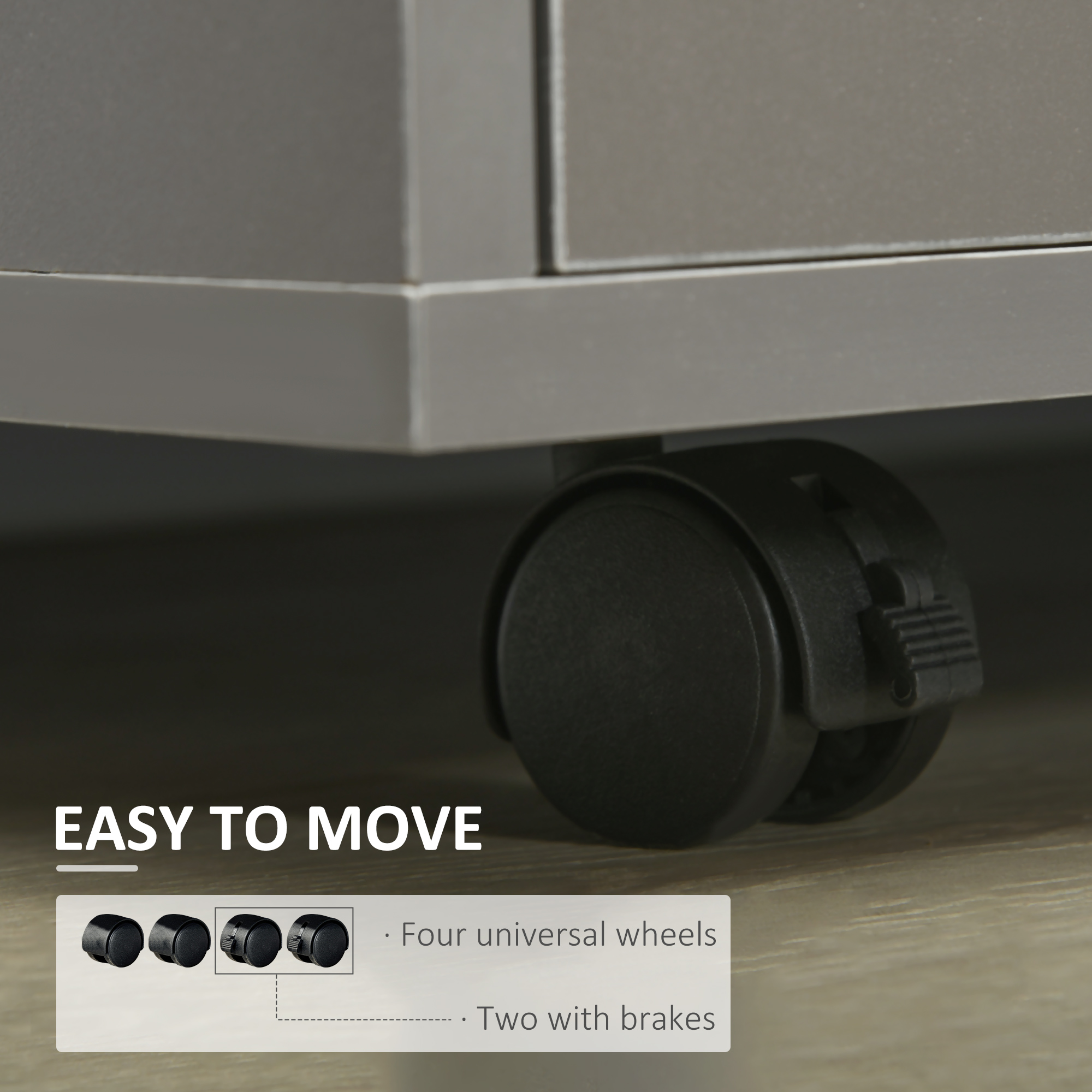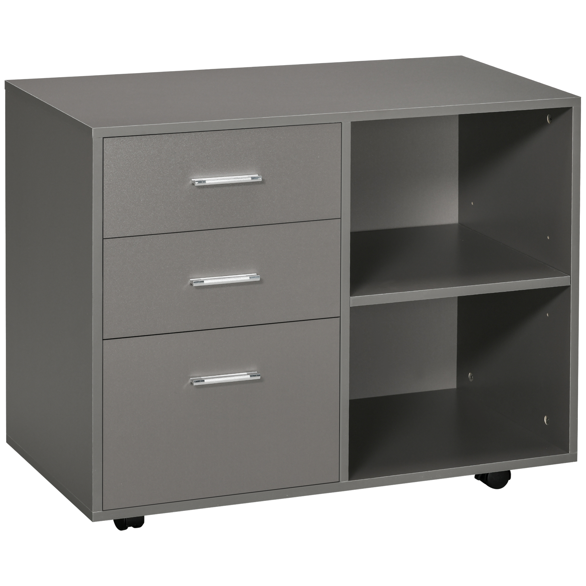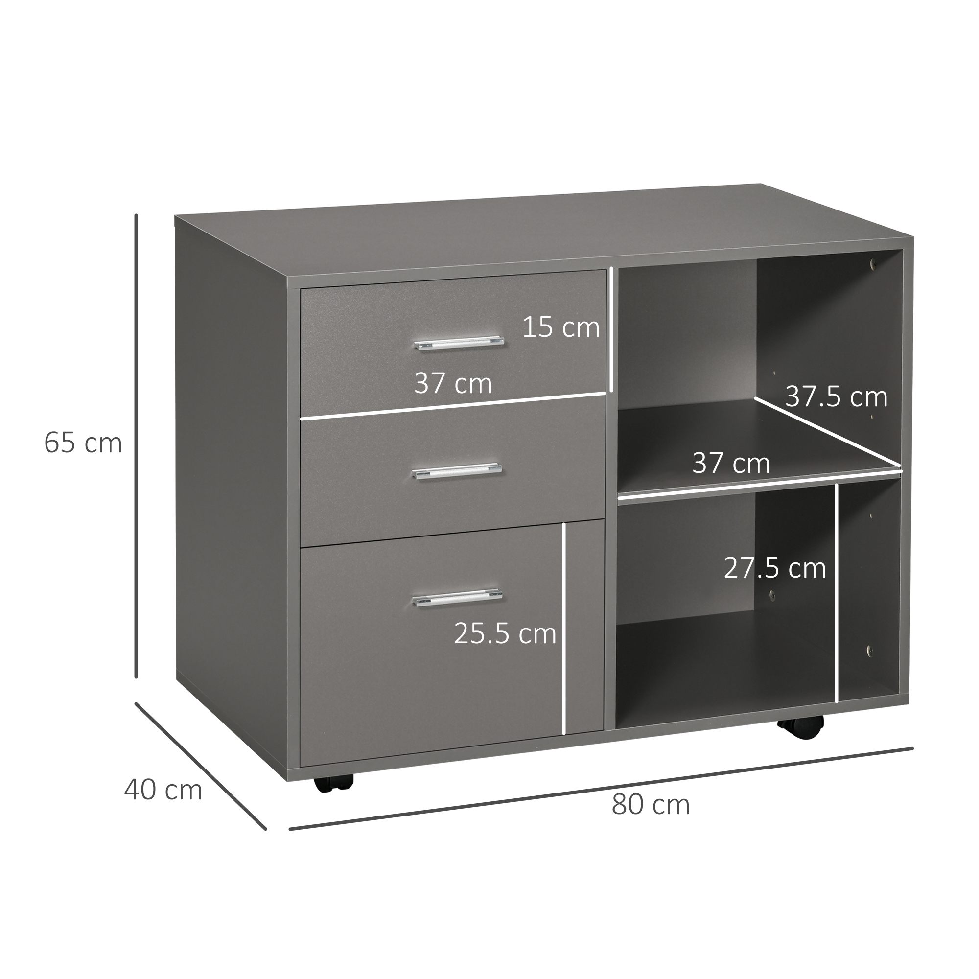 Give your office style and storage all at once with this cabinet from HOMCOM. It features two open compartments and three drawers, giving you plenty of space to keep files, folders and stationary organized. The shelf on the right can be adjusted to suit your needs. Four castor wheels ensure easy movement, with two lockable to keep stationary. It's made from particle board, ensuring it is tough and durable for everyday use, in a black colour for a sleek addition which sits well-placed anywhere.