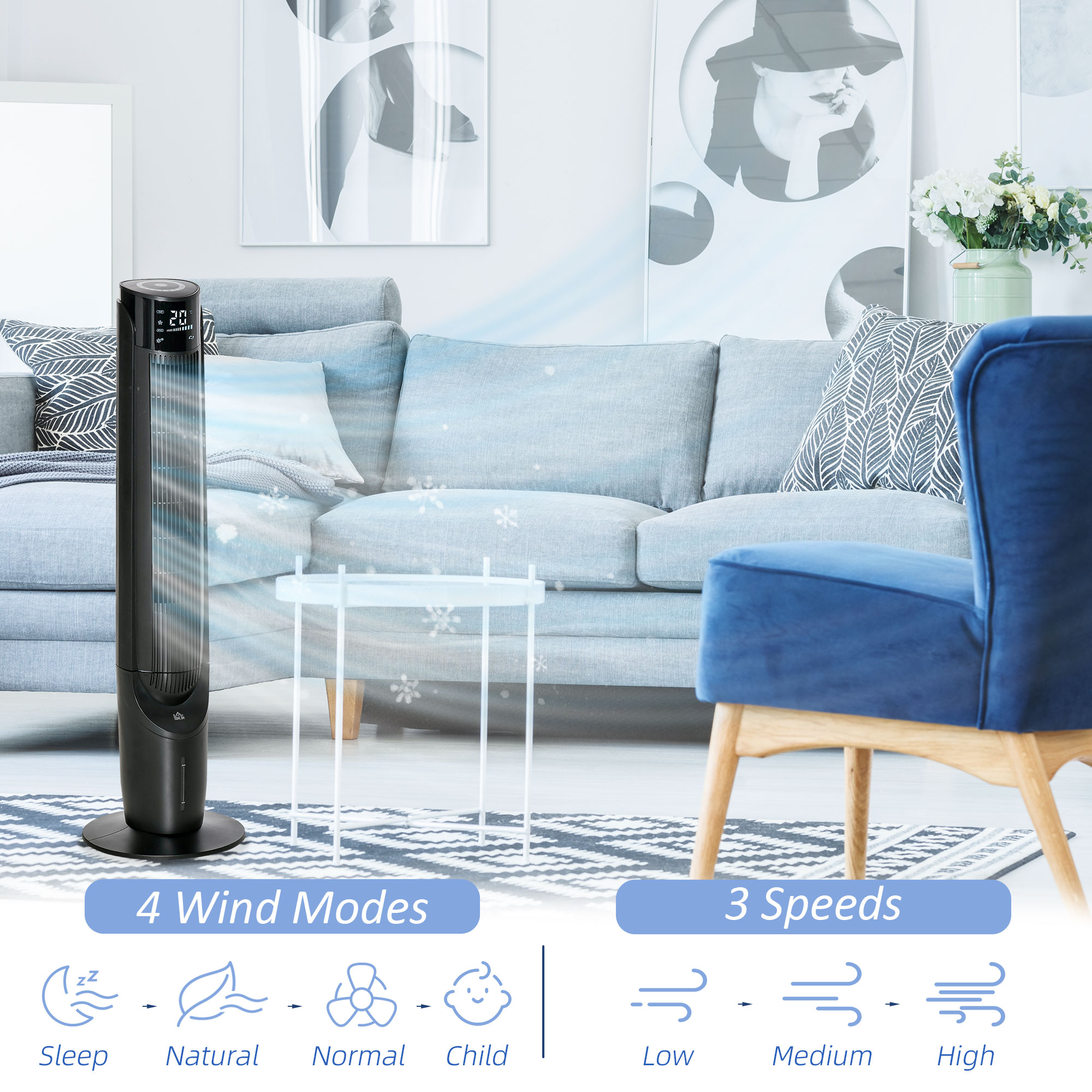 - 4 modes, normal, natural, sleep and child. 3 speeds, low, medium and high