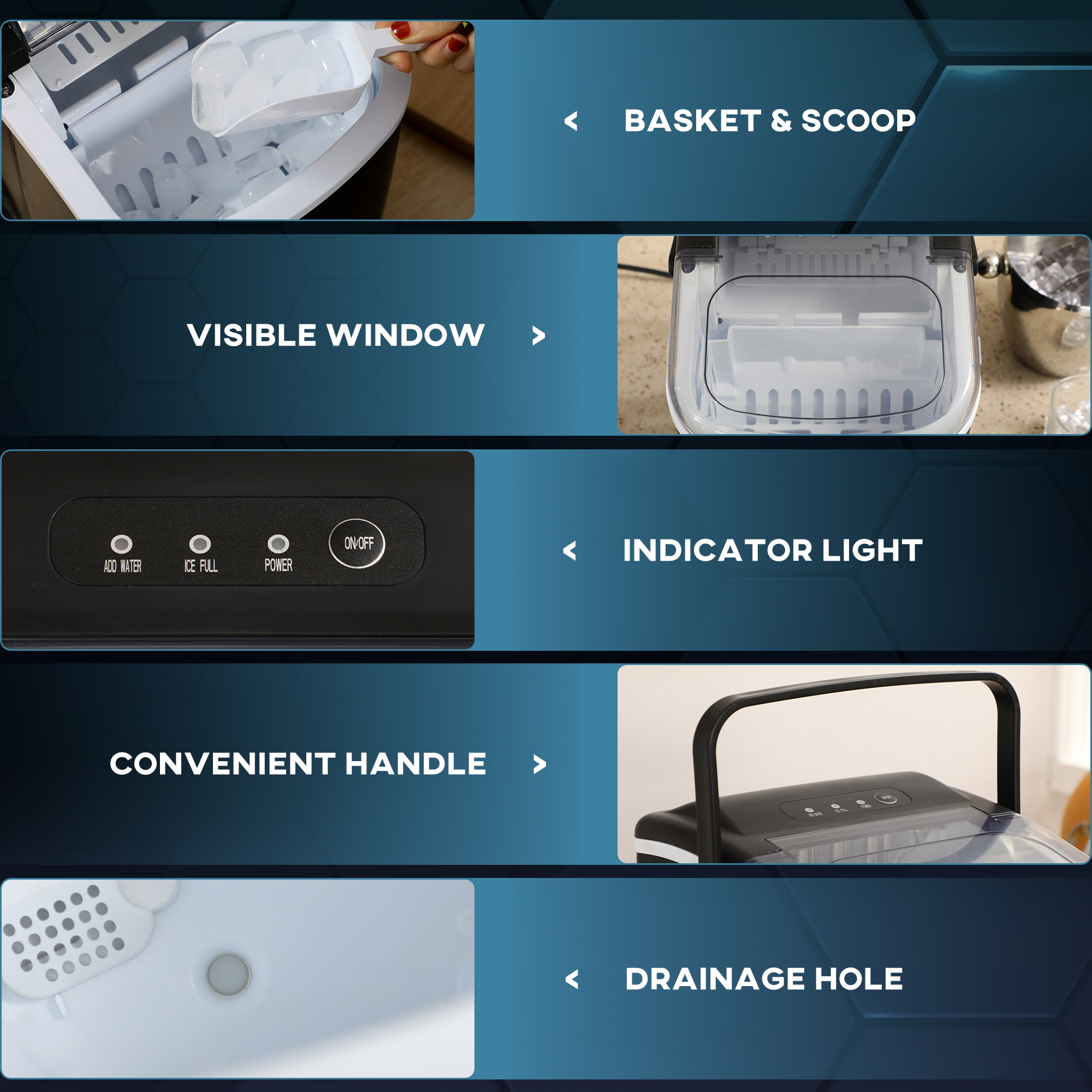 - Ice Production: 12kg/day, 9pcs/ 6-12minutes