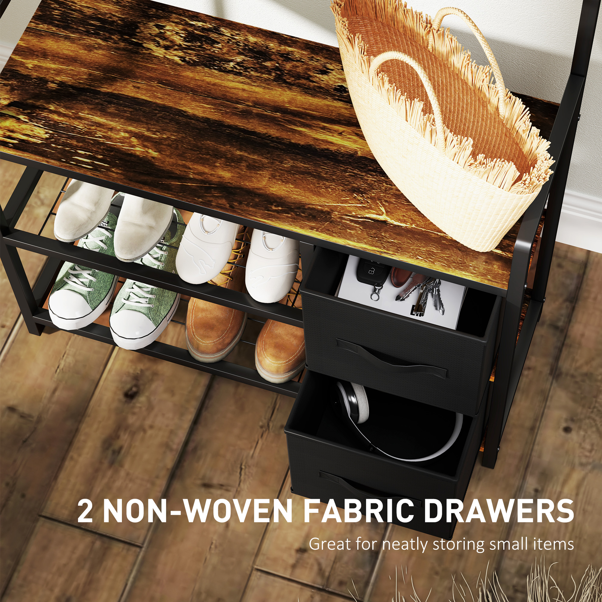 Make this HOMCOM hall tree the centerpiece of your hallway - an effortless blend of 15 coat hooks, a bench, two shoe racks and two removable fabric drawers - keep coats, shoes, accessories and more in one spot. It comes in an industrial style design: bold and striking - this will bring plenty of character into your home. Comes with anti-tipping straps to securely fix to a wall.