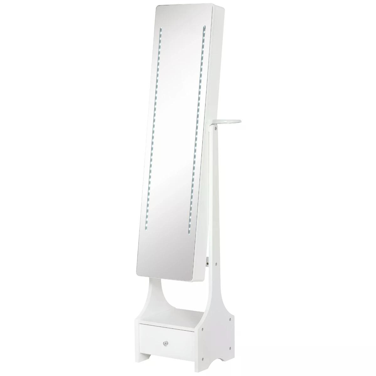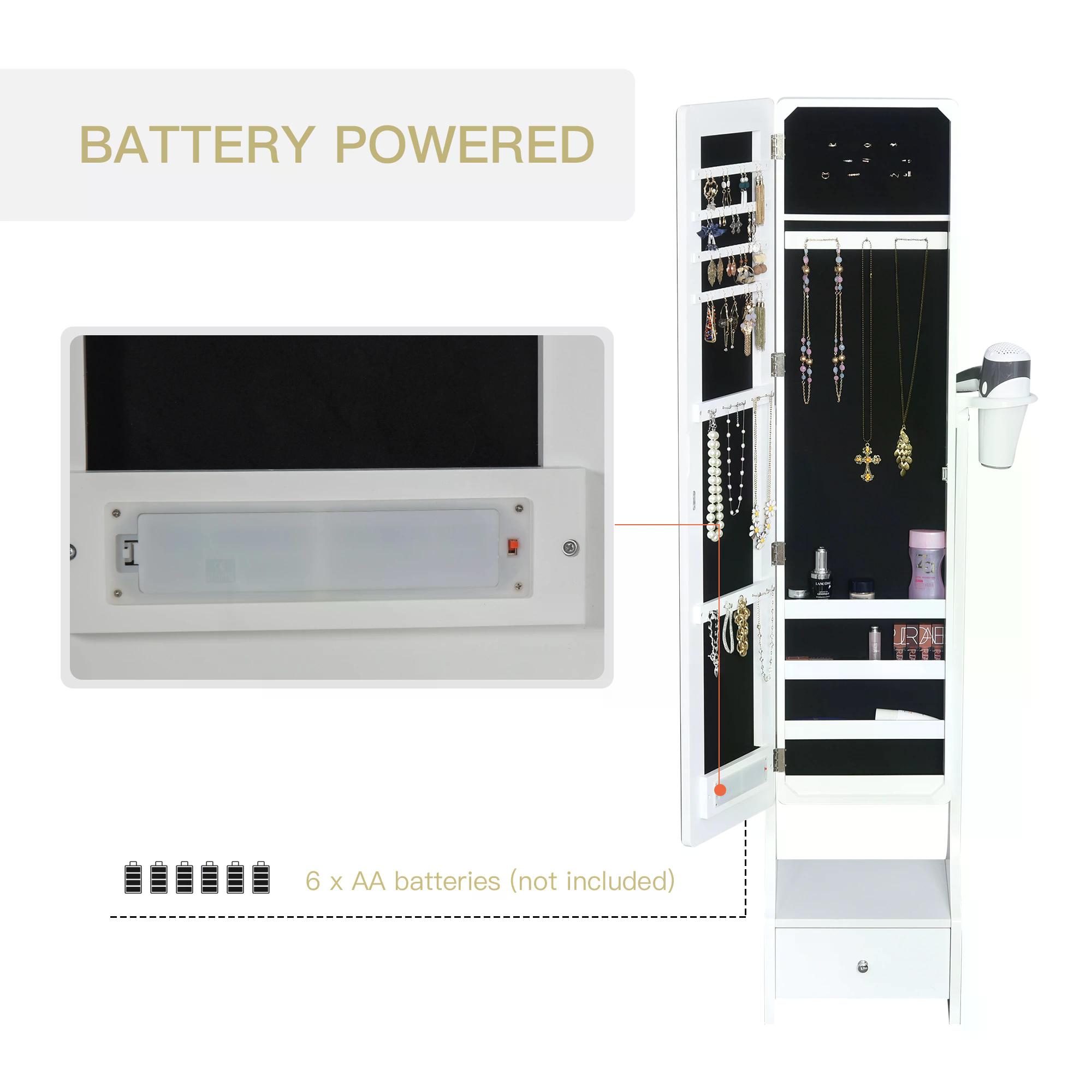 Keep all your jewellery organised and easily accessible with this storage mirror armoire from HOMCOM. On the outside, a full-length mirror is fitted with two strips of LED lights so you can get ready day and night. Inside features 56 earring slots, 15 necklace and bracelet hooks, 77 ring slots, multiple shelves and a large bottom drawer, giving you plenty of room for keeping everything stored and organised. The MDF frame is solid and reliable for everyday use, holding the mirror on firmly. The mirror angle can be adjusted to suit you, and it's finished with a hairdryer holder for extra efficiency and ease when getting ready. 6 x AA batteries required for the lights, not included.