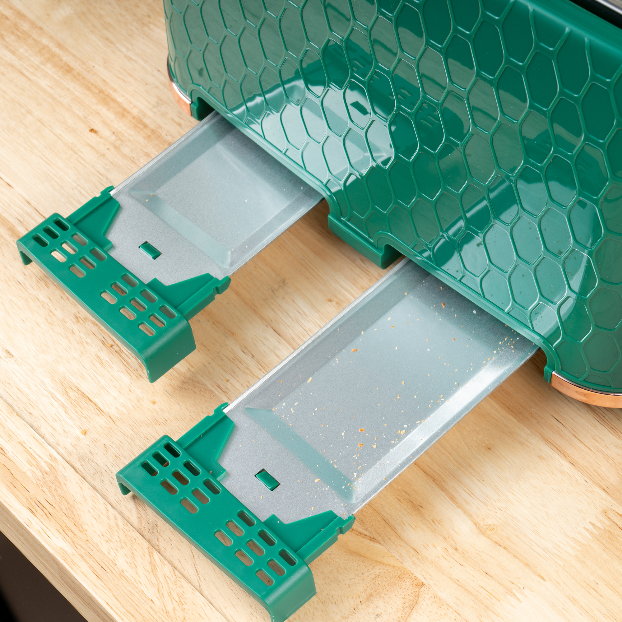 - Crumb tray on toaster for easy cleaning