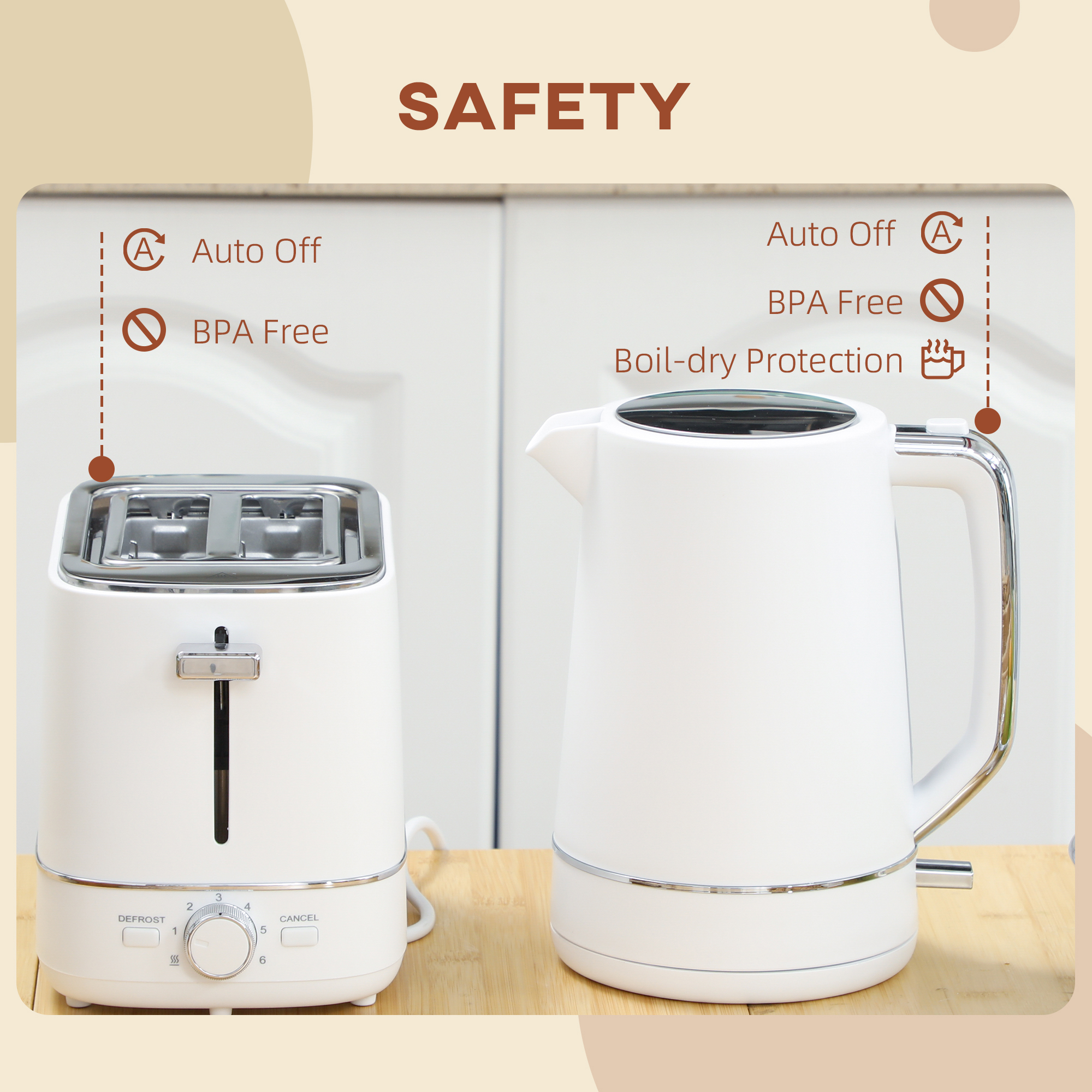 - Kettle and toaster include automatic shut-off and made of BPA-free materials for safety. Kettle also has boil-dry protection