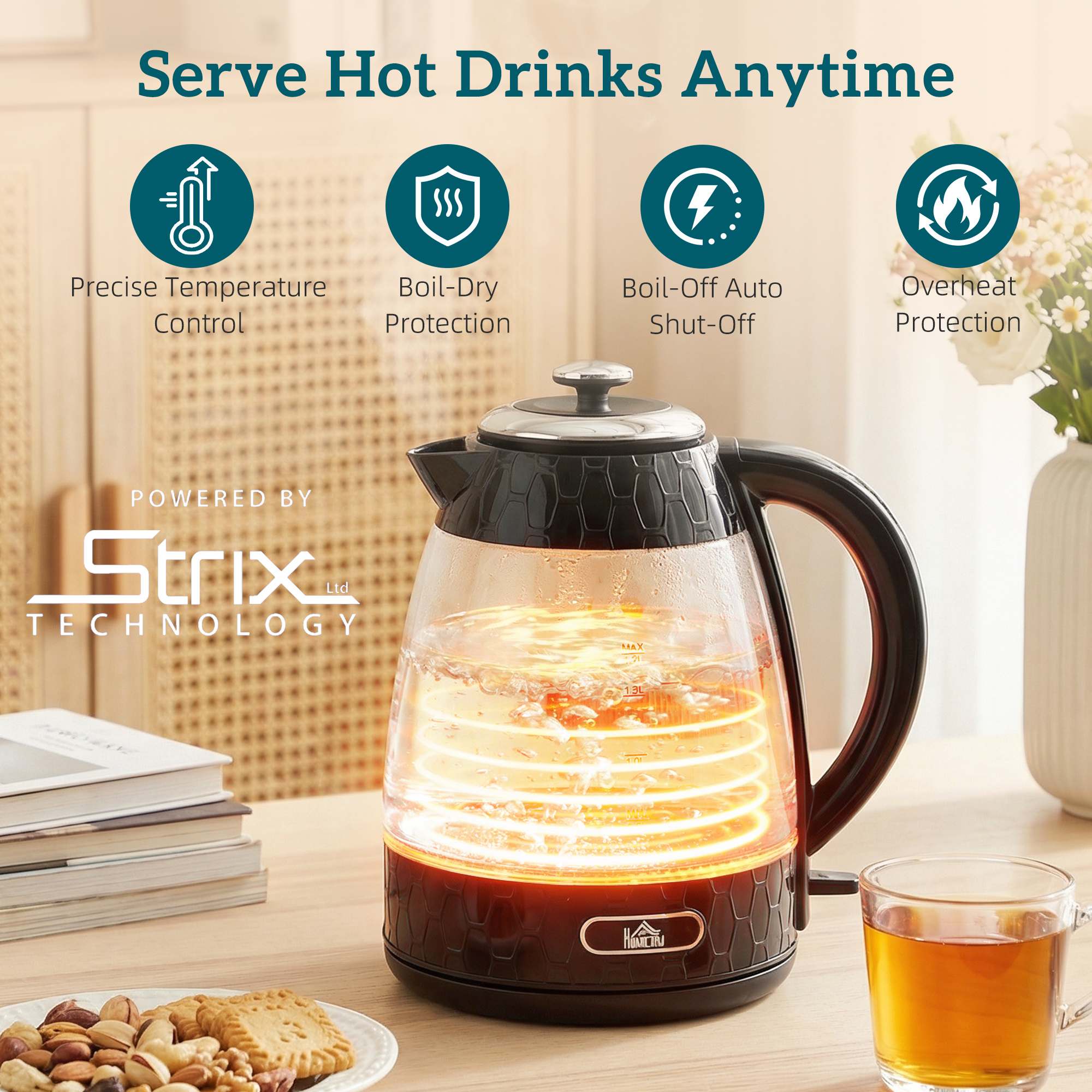 - Auto shut-off and boil-dry protection ensure safe operation