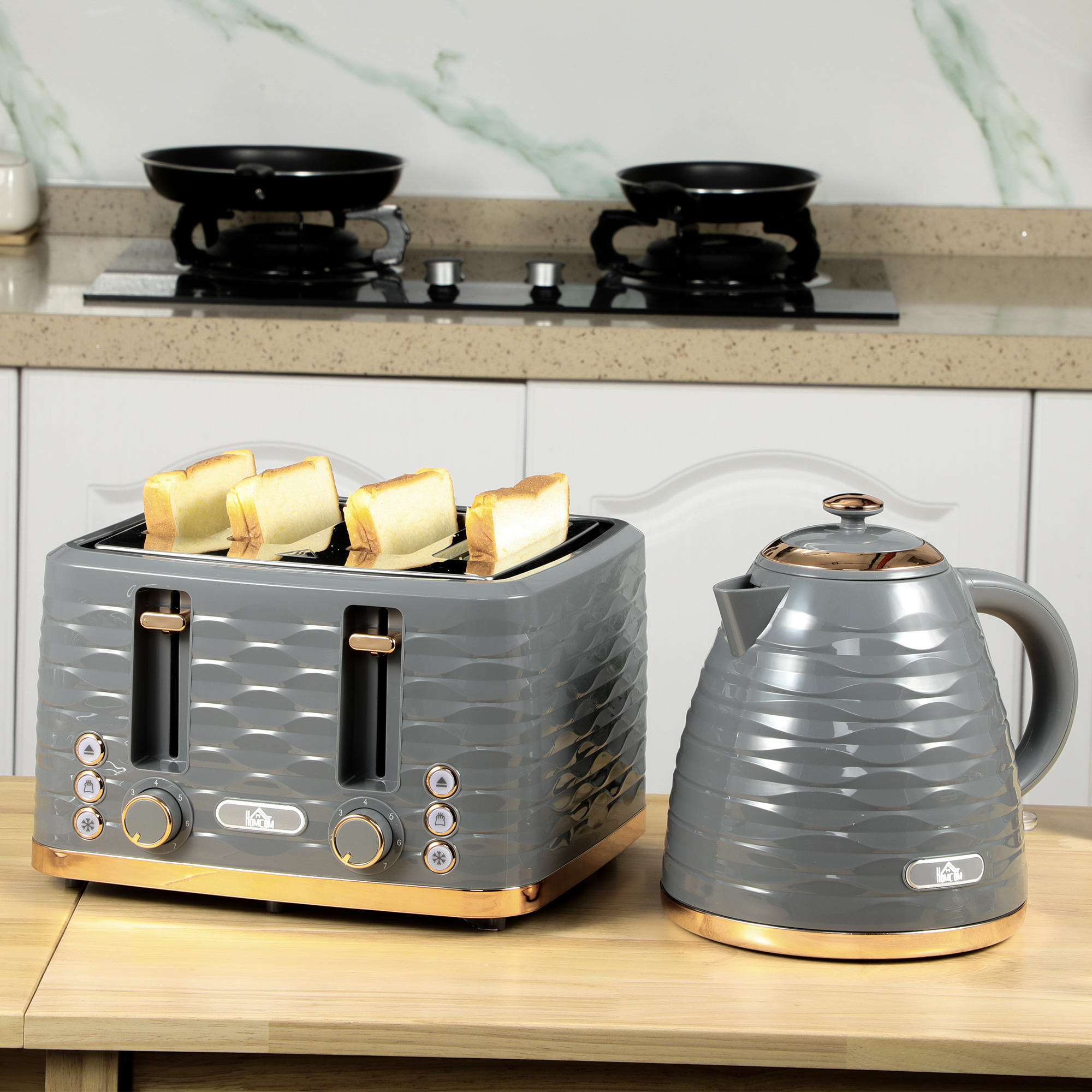 A matching, complementary kitchen starts here, thanks to this HOMCOM set. Comes with a 1.7 litre rapid boil kettle and four-slice toaster. Both come in ridged texture with glossy finish, complete with chrome-coloured accents for a chic, polished look. The toaster has seven browning levels so you can choose your favourite level. The water kettle can make up to six cups of tea - great for when friends come round and you want a catch up. Hungry and thirsty, anyone?