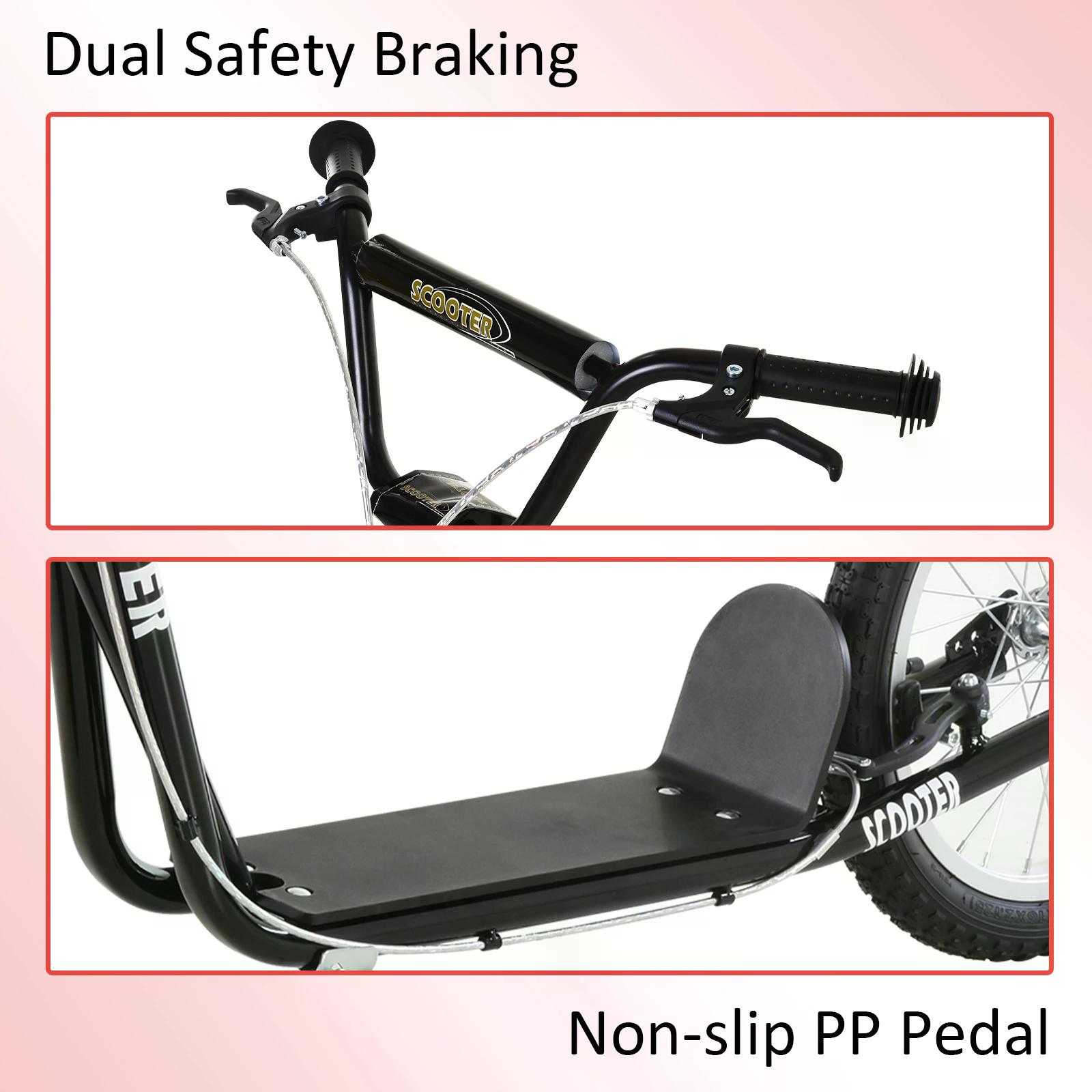 Glide outdoors in style with this scooter for kids from HOMCOM. This scooter with big wheels is made with a front and rear braking system, which allows you to stop immediately while riding along, with the low platform and two big treaded rubber wheels making the journey smooth and enjoyable. Using steel for the structure to handle up to 100kg, the handlebar can be adjusted between 90cm and 96cm so you can set it to a comfortable holding height.