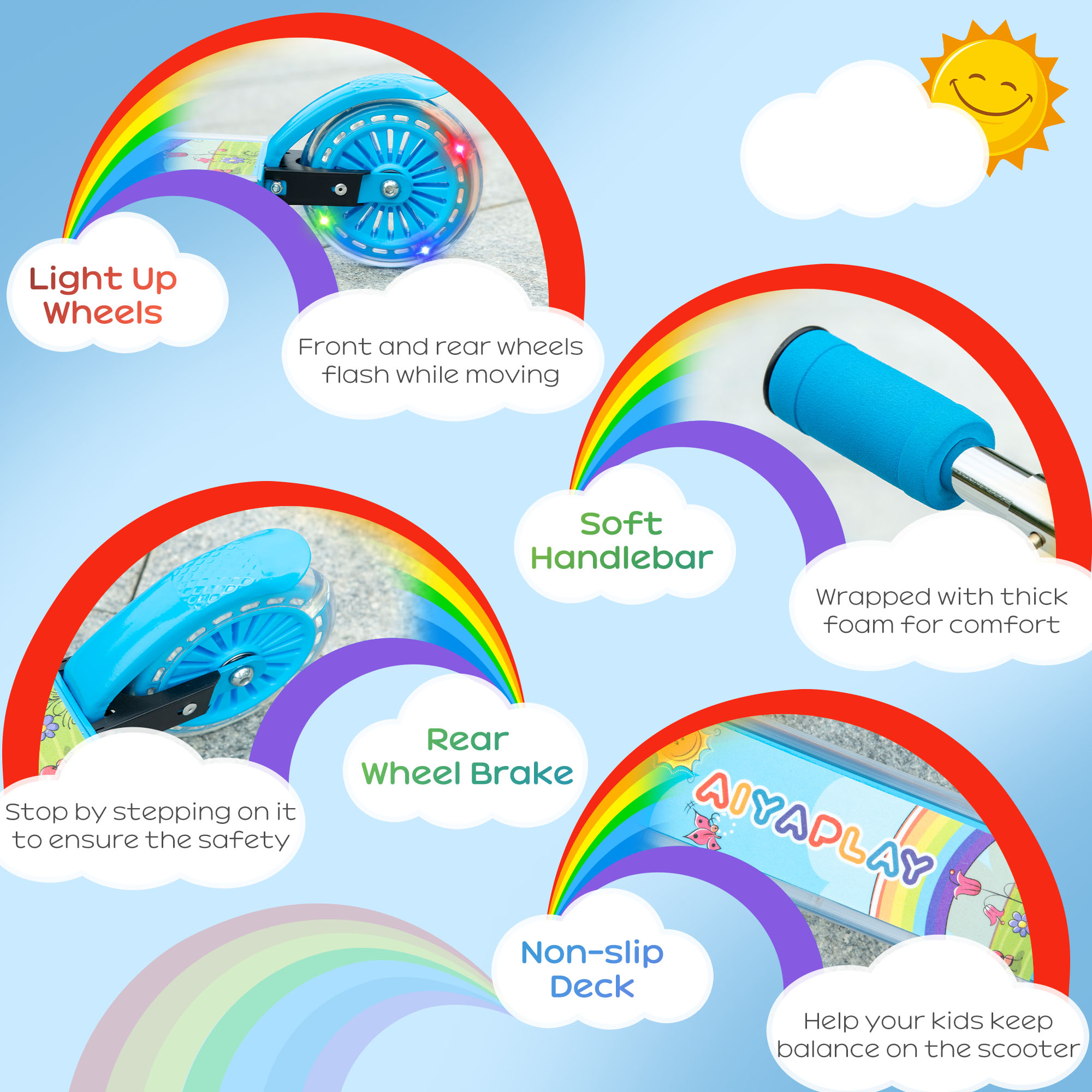 With this HOMCOM kids scooter, days out are extra special. As they ride, the wheels light up, whilst the LED around the foot deck glow when the switch is on. There's also built-in music, which adds to the fun. With adjustable handlebars and a durable metal frame, it's suitable for long term use – as your child grows, so will the kids scooter. It's wrapped with thick foam, making it comfortable to hold. Finished with a rear brake, which brings it to a swift stop; a safe way for endless enjoyment.