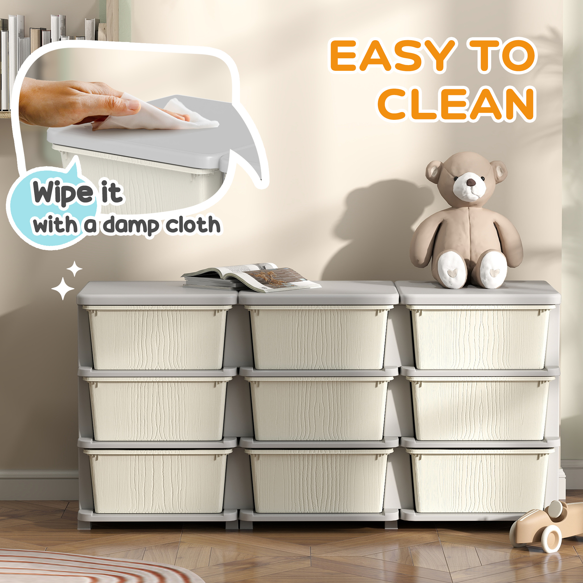 Getting them to keep home tidy is easy with this toy storage drawer from HOMCOM. Made from great PP material, the kids storage is tough, so it's suitable for daily use. It features nine drawers, so there's plenty of storage space for toys, books and more. The surface is smooth so it wipes clean easily, with rounded corners to prevent any accidents. Finished with a base and stump feet so it keeps balanced. Suitable for ages 3-6 years.