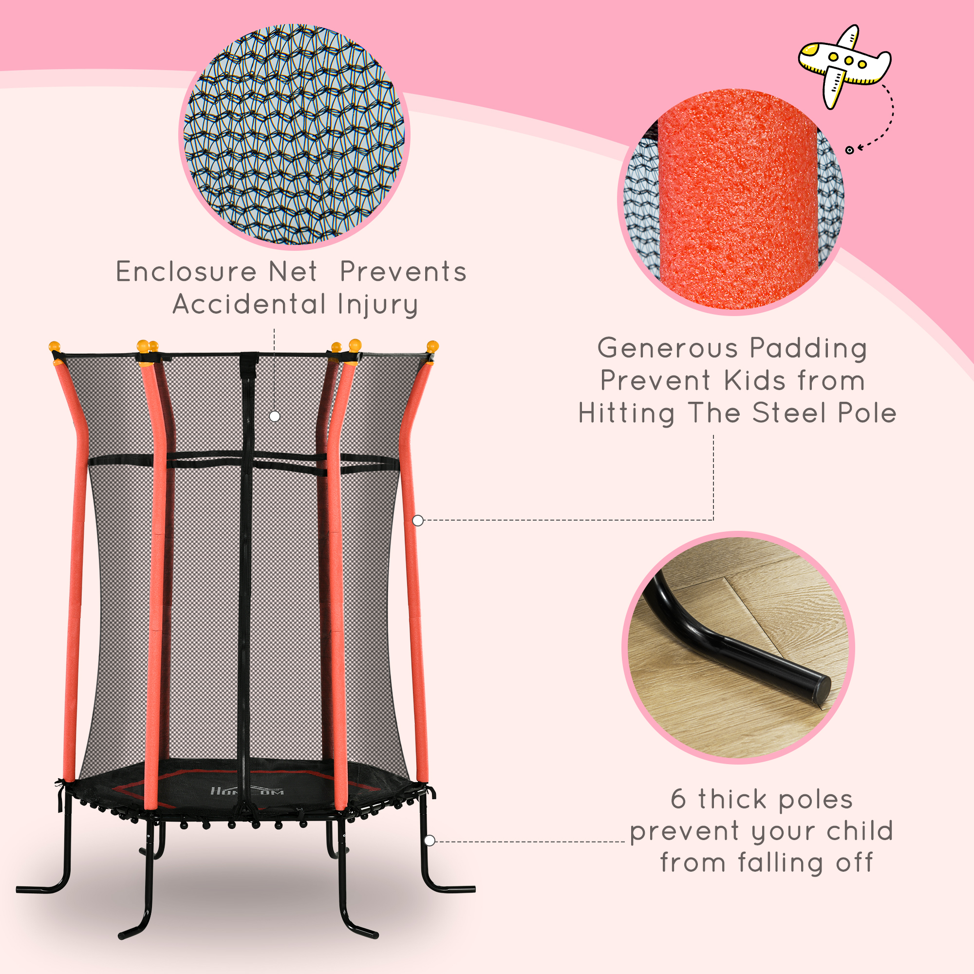 - A safety enclosure and padded poles to keep kids secure on the trampoline