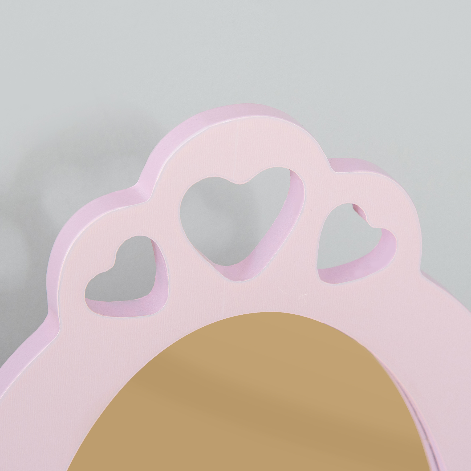 Princess perfect in a set. This dressing table and stool, from HOMCOM, is a noble way for them to get ready day and evening. Pink in colour, it features heart cut-outs on the top and side of the mirror for extra magic. The curved legs of the table and stool create a modern and relaxed look. There's a small drawer for keeping accessories safely stored. The mirror allows your child to get ready - whether just pretend getting ready, or going out to see friends.