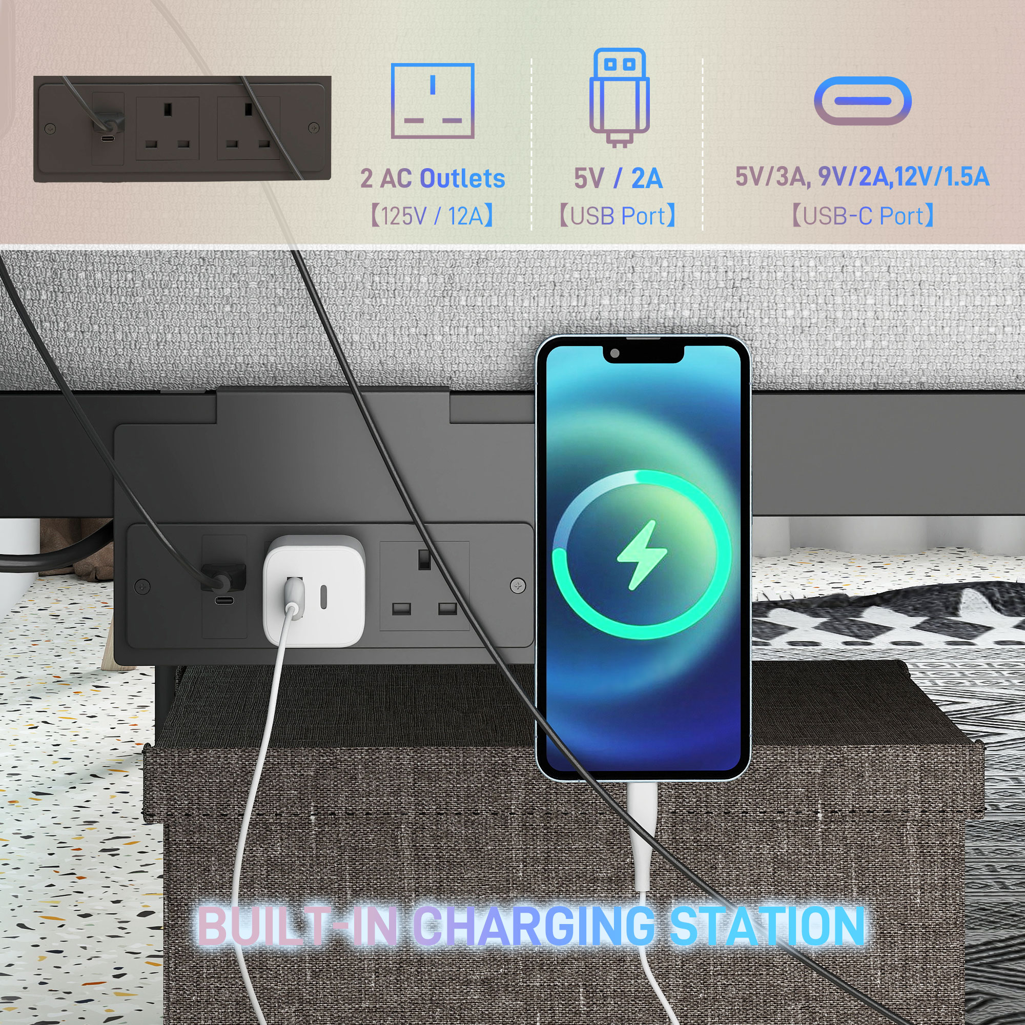 - Built-in two AC outlets, a USB port and a USB-C socket