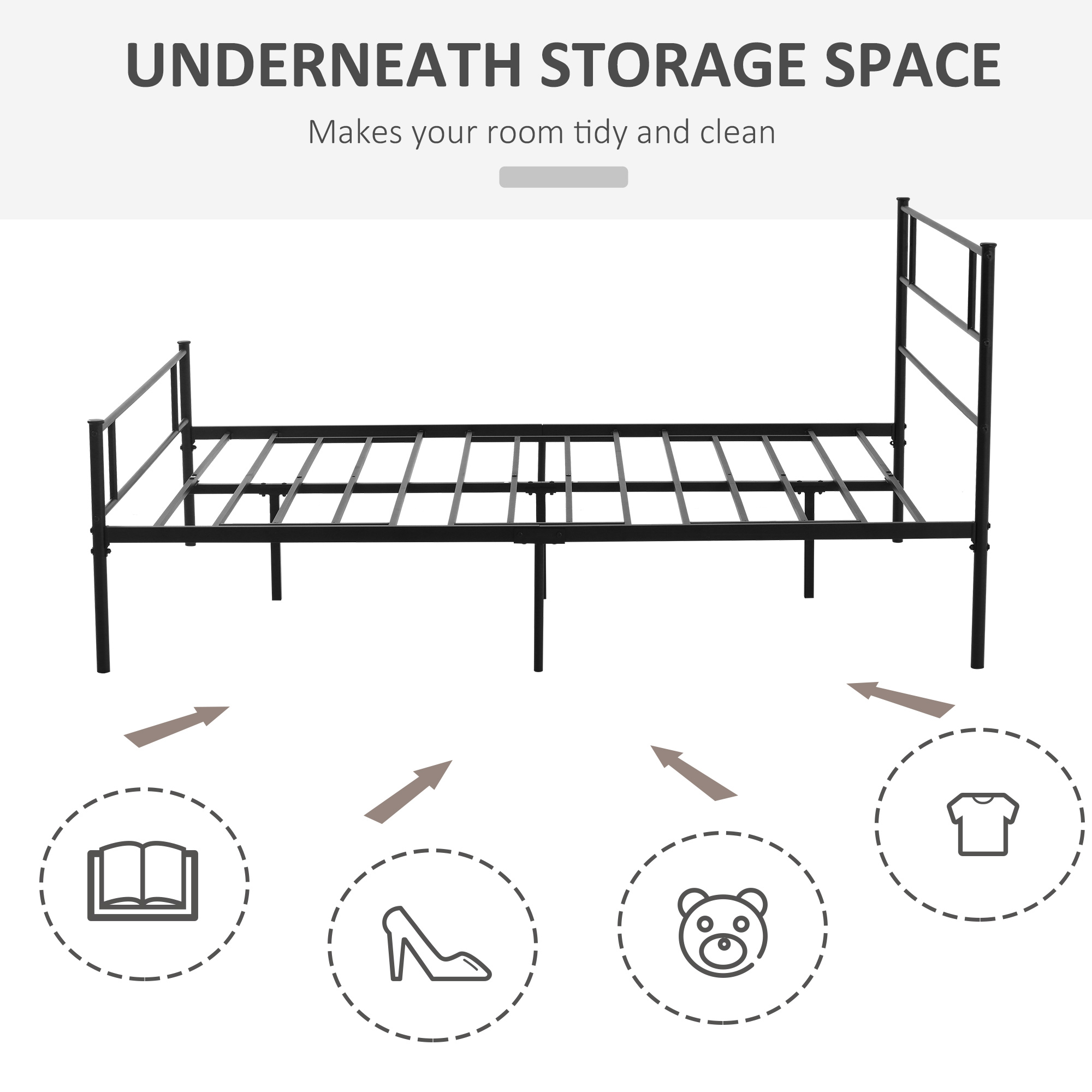 Make dream times minimal with this bed frame from HOMCOM. The slim-cut frame, in a matte black finish makes it suitable for practically any bedroom space - whatever your interior decor. Made from metal with sturdy legs, this frame will keep you supported so you can rest and relax in peace - with the built-in slats and tall headboard holding your mattress in place at all times. Comes with spacious under-bed clearance, giving you handy, out-of-sight storage space.