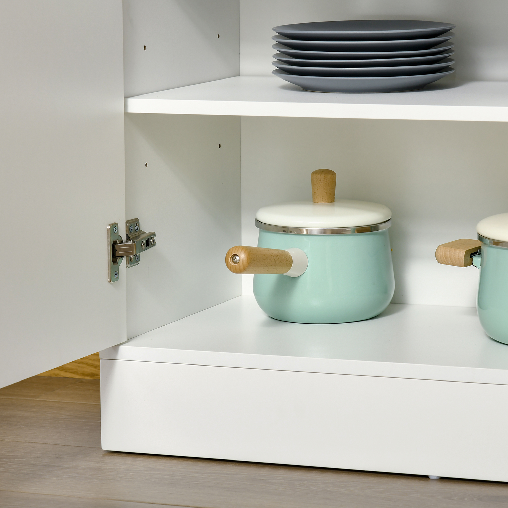 Need more storage options in the kitchen? Then this HOMCOM kitchen cabinet is here to help! Six tiers are formed of two adjustable shelves in the bottom cupboard, with three open shelves on the top; a mix of open and discreet storage. Made from a blend of MDF and particle board, the structure of the kitchen dresser is sturdy and reliable for daily use. Add style, whilst reducing visible clutter with this handy kitchen cupboard.