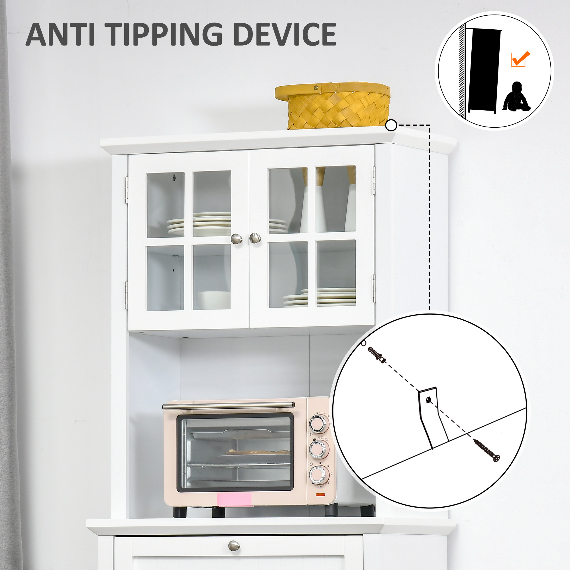 Create more storage space with this freestanding kitchen dresser from HOMCOM. The pantry cabinet features two separate cabinets, an open middle area and a wide drawer to fulfill all storage needs. The top cabinet comes with glass panel doors so you can see inside easily, and both the top and bottom spaces have adjustable shelves. The durable MDF structure is finished with a smooth coat of paint for extra protection, finished with anti-tipping straps on the back for safety.
