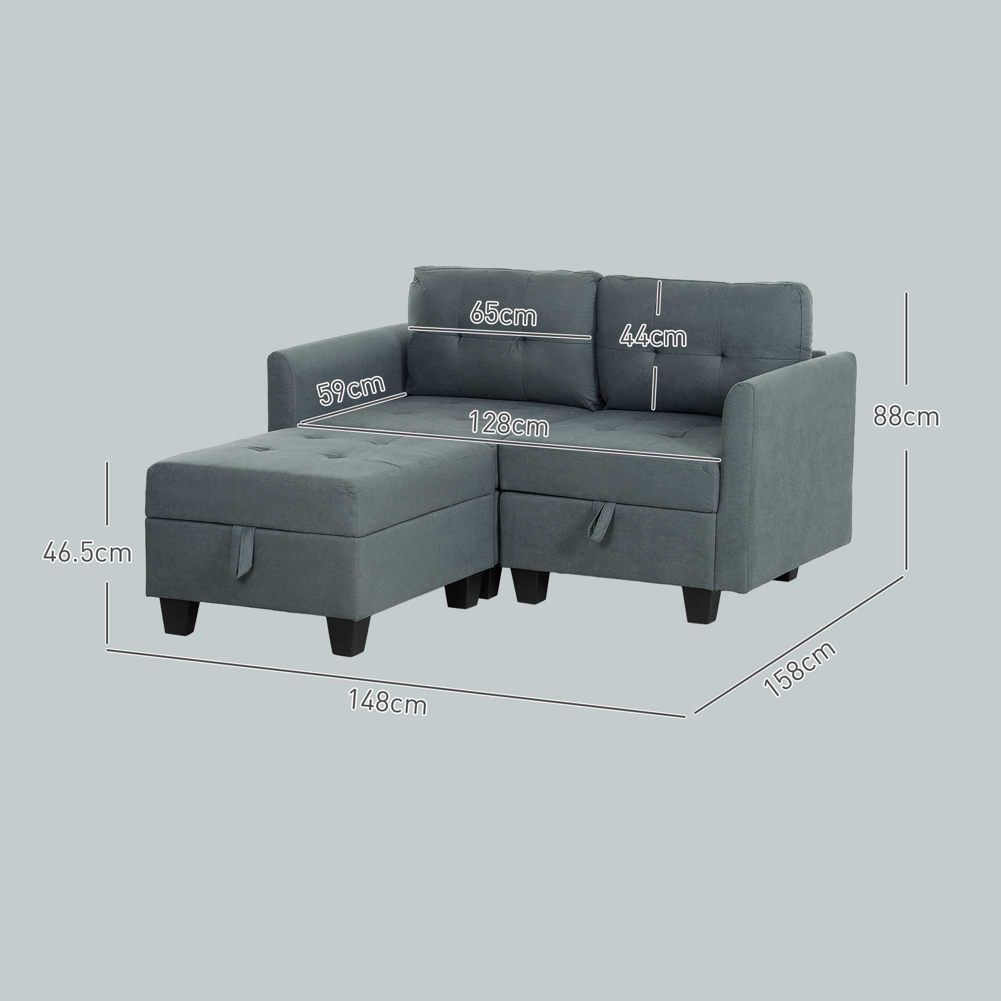 A sofa set, your way with this HOMCOM sofa set. The modular design allows you to build into the shape and size you want. Under each module there is storage space, providing convenient room for small furnishings and similar - it's easy to keep the area tidy day and night. Sink into this corner sofa thanks to the thick padding; this is a great companion for day and night use.