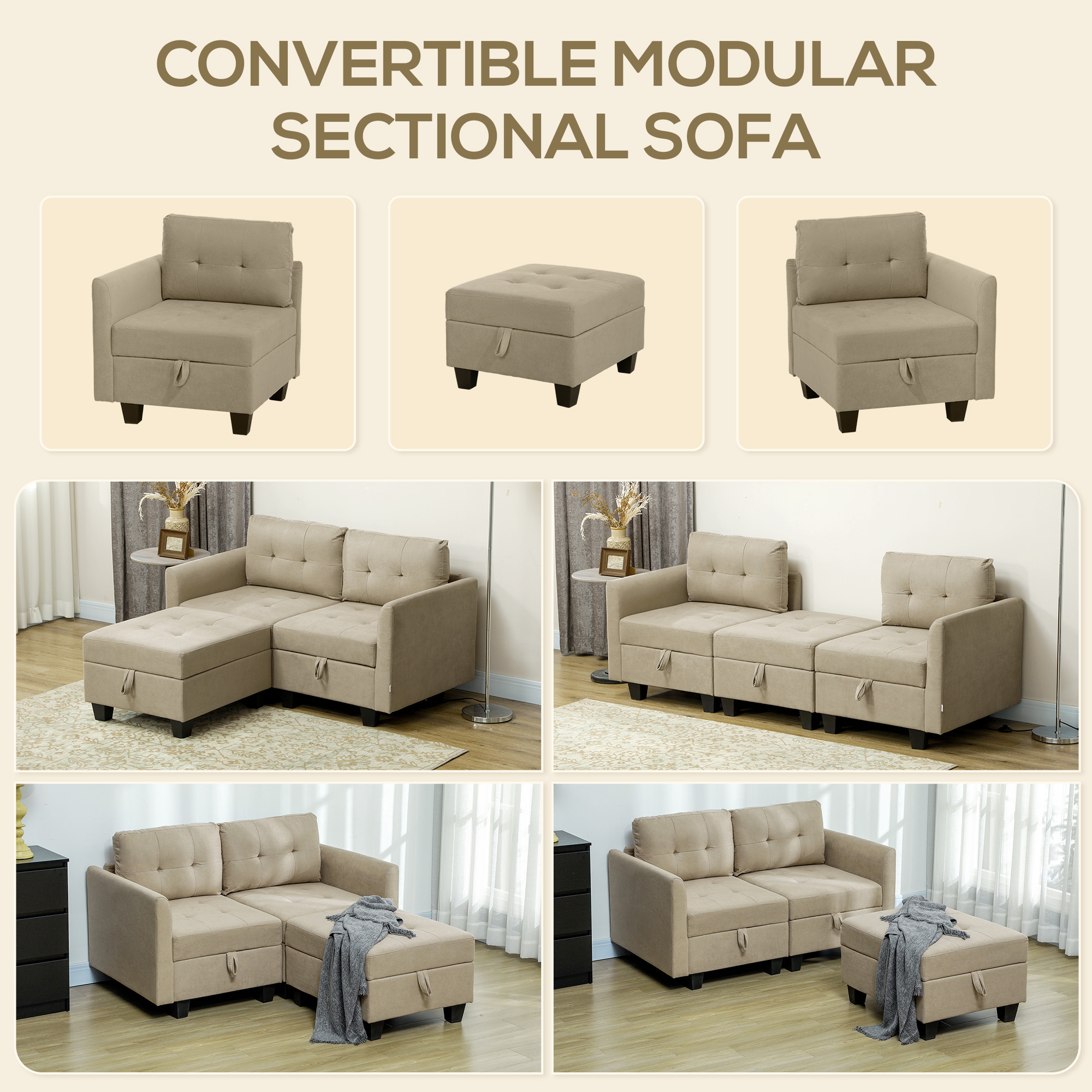 A sofa set, your way with this HOMCOM sofa set. The modular design allows you to build into the shape and size you want. Under each module there is storage space, providing convenient room for small furnishings and similar - it's easy to keep the area tidy day and night. Sink into this corner sofa thanks to the thick padding; this is a great companion for day and night use.