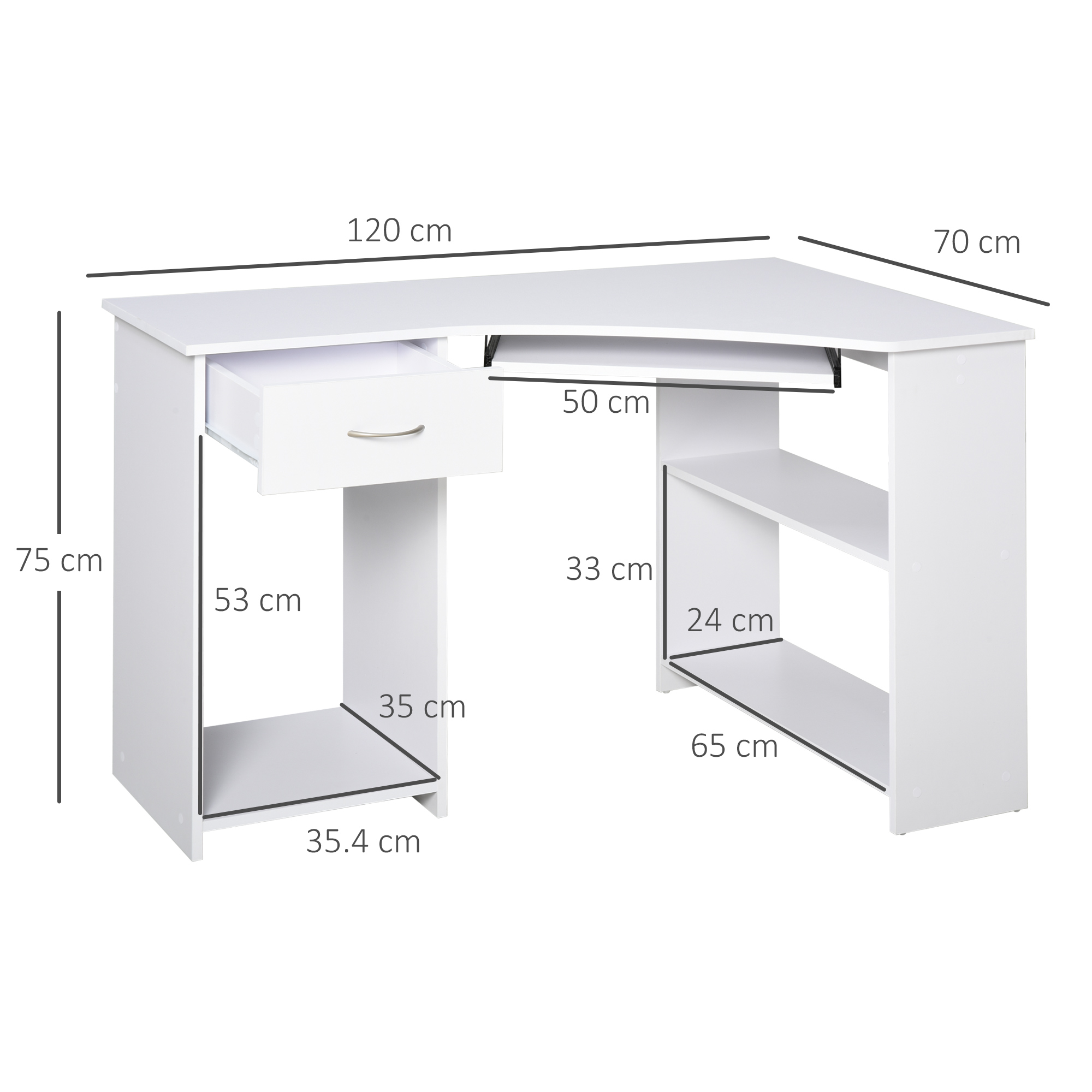 Make the most of those unused corners with this 'L' shaped desk from HOMCOM. This space-efficient piece is made with two wide shelves, an open oblong compartment, a slide-out drawer, keyboard tray and open table top - giving you lots of room needed for working from and keeping your essentials stored. It's made from particle board, meaning the structure is tough and durable so you can use it every day with confidence. It's finished with a smooth melamine coating, which keeps its surface lightly protected and makes it easy to clean. The perfect place to focus your attention all day long.
