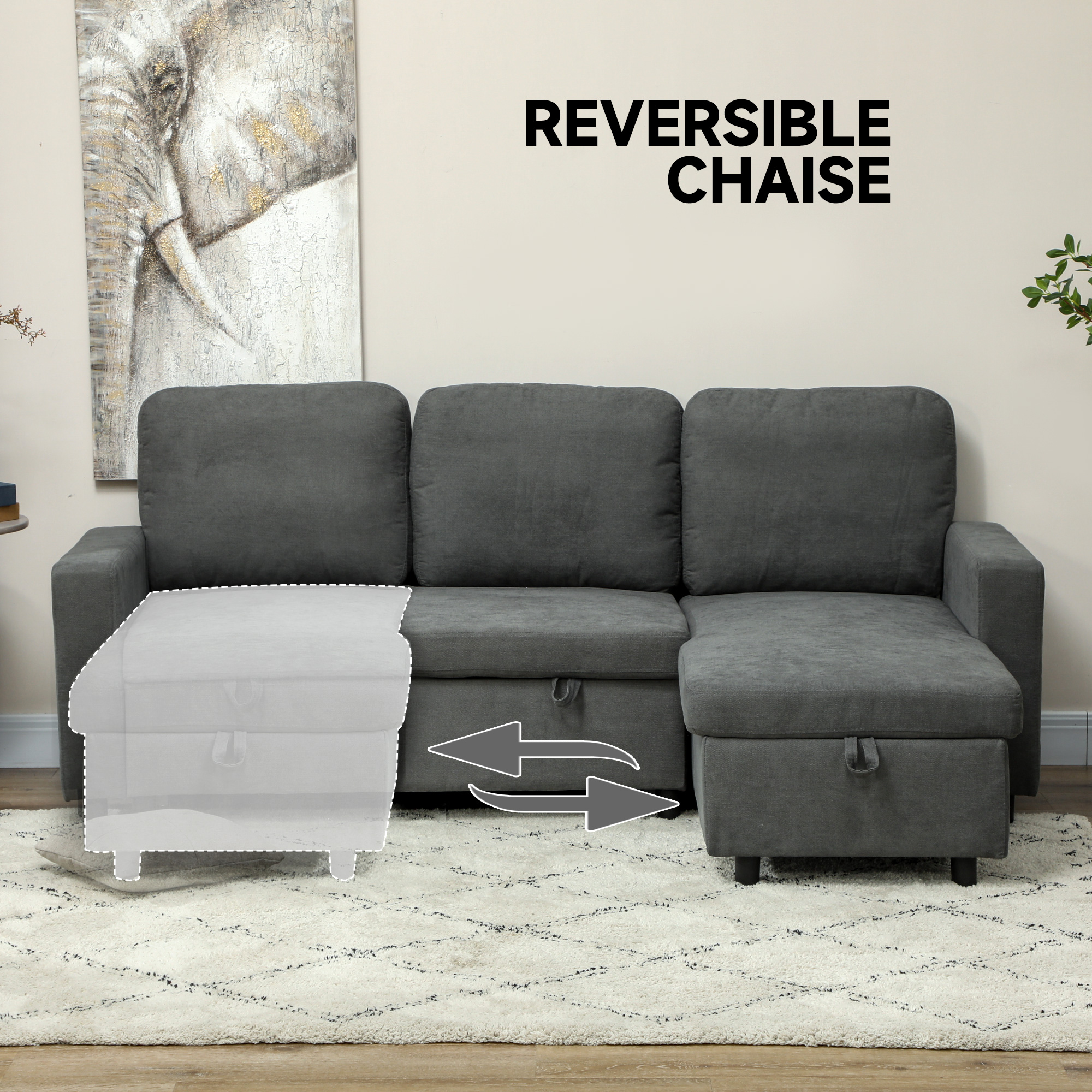 This HOMCOM three seater sofa bed is here from day to night. Convert from a loveseat into a double sofa bed with a simple pull. Plus, utilise the small storage under the chaise, suitable for blankets and more. Whether for comfortable everyday lounging or accommodating overnight guests, this L shaped sofa bed does it all.