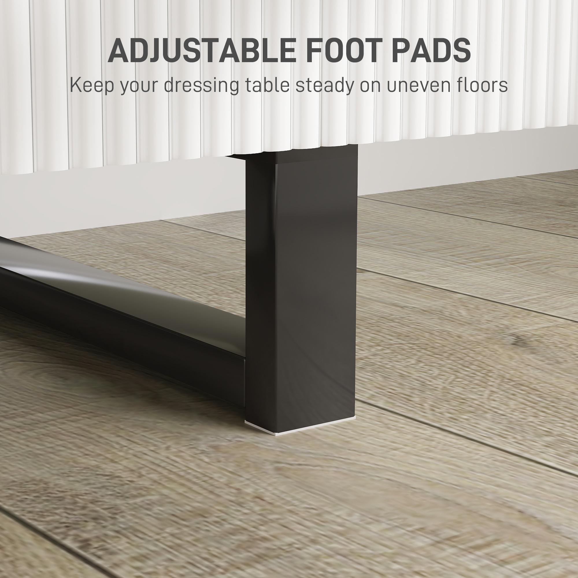 Transform your daily routine with the HOMCOM vanity desk with mirror and drawers! Its USB-powered lighted mirror adds a touch of glam, ensuring flawless makeup application. Tidy up with ease using two bottom and three side drawers. This modern, leaf-shaped mirror makeup desk, complete with a robust metal frame, is the stylish organisational solution you've been searching for.