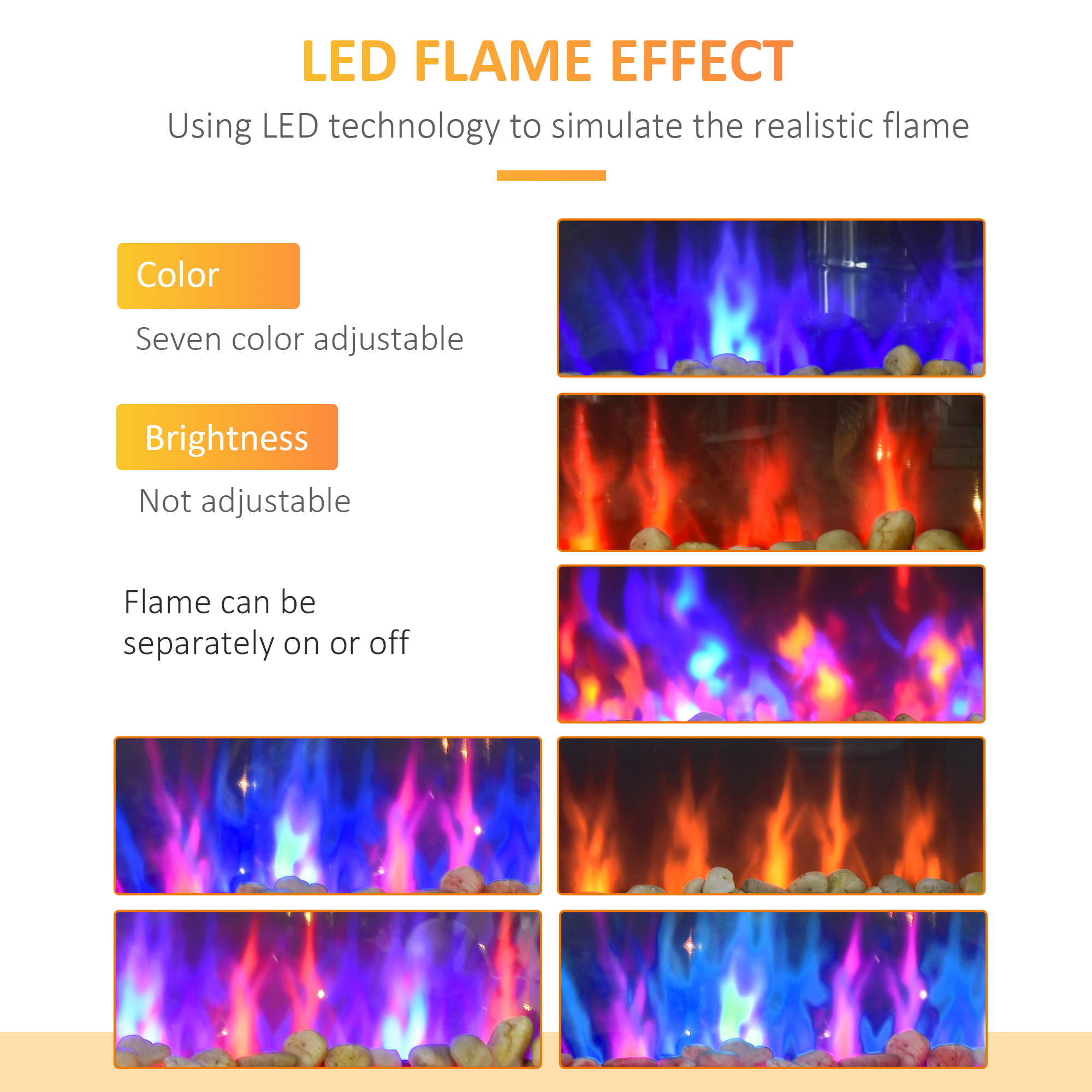 - LED display shows a realistic flame effect with pebbles, can be used with the heat off. Shows time and temperature