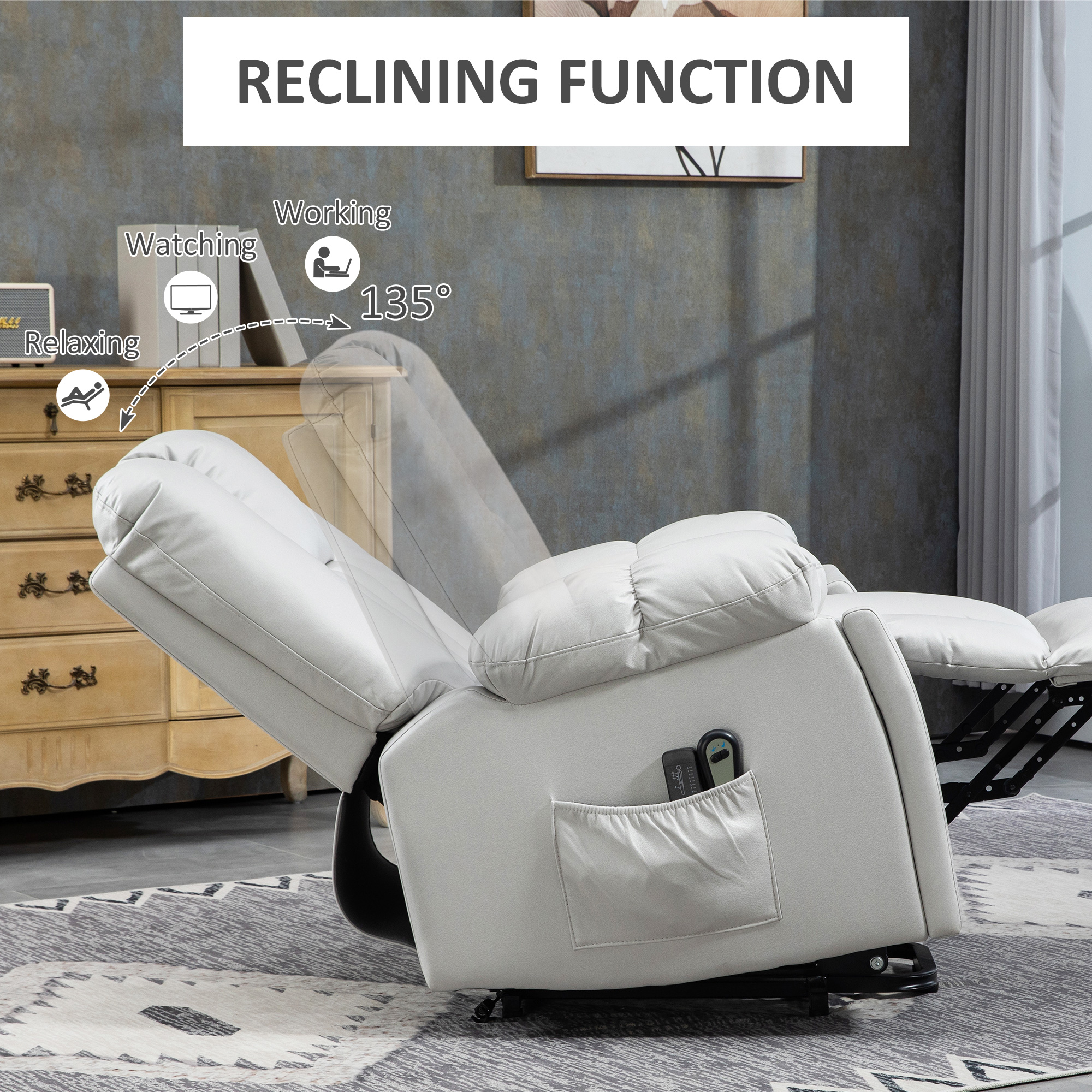 For that little help moving in and out, along with soothing your body whenever, choose this HOMCOM massage power lift chair. The 45° lifting seat lifts you up and lowers you down gently - great for the elderly and those with injuries. The 135° reclining back and footrest means total body relaxation. Features eight vibrating massage points - four modes - to soothe any body aches. Recliner chair finished with faux leather upholstery for a sleek, stylish look.