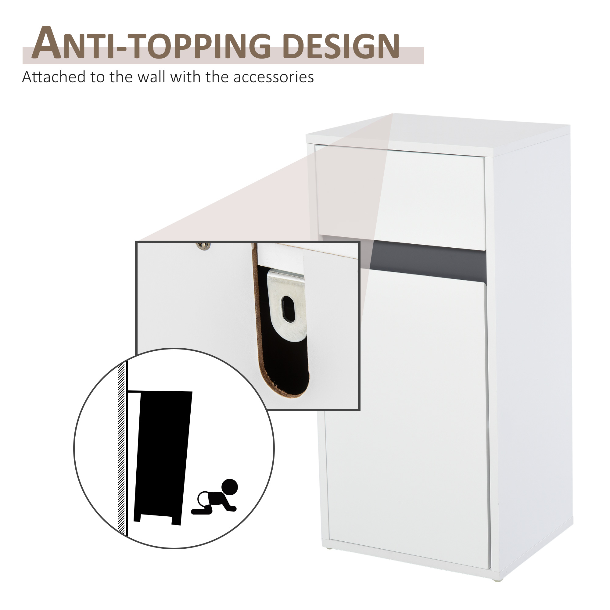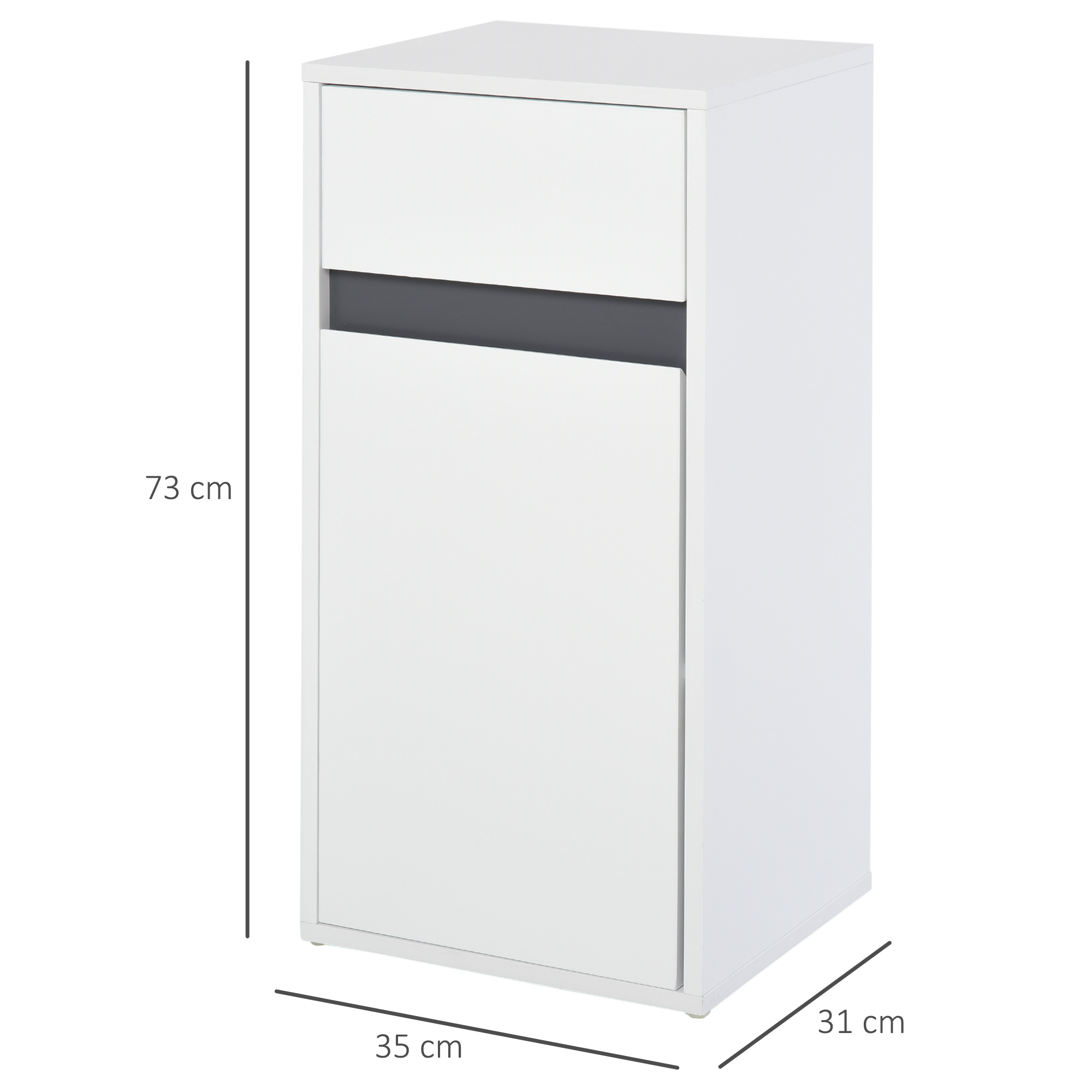 Introduce modern styling into your bathroom with this storage cabinet from HOMOM. Using white moisture-resistant MDF for the structure, and crafted into an effortlessly sleek design, it features a cupboard and drawer - both which are discreetly concealed so your bathroom adopts an ultra-tidy feel. Inside the cupboard, an adjustable shelf is placed to organise your bottles, toiletries and other products. Slightly small in size, it will perfectly fit into places with little space to spare, and it is finished with a flat top for extra holding room if required.\n