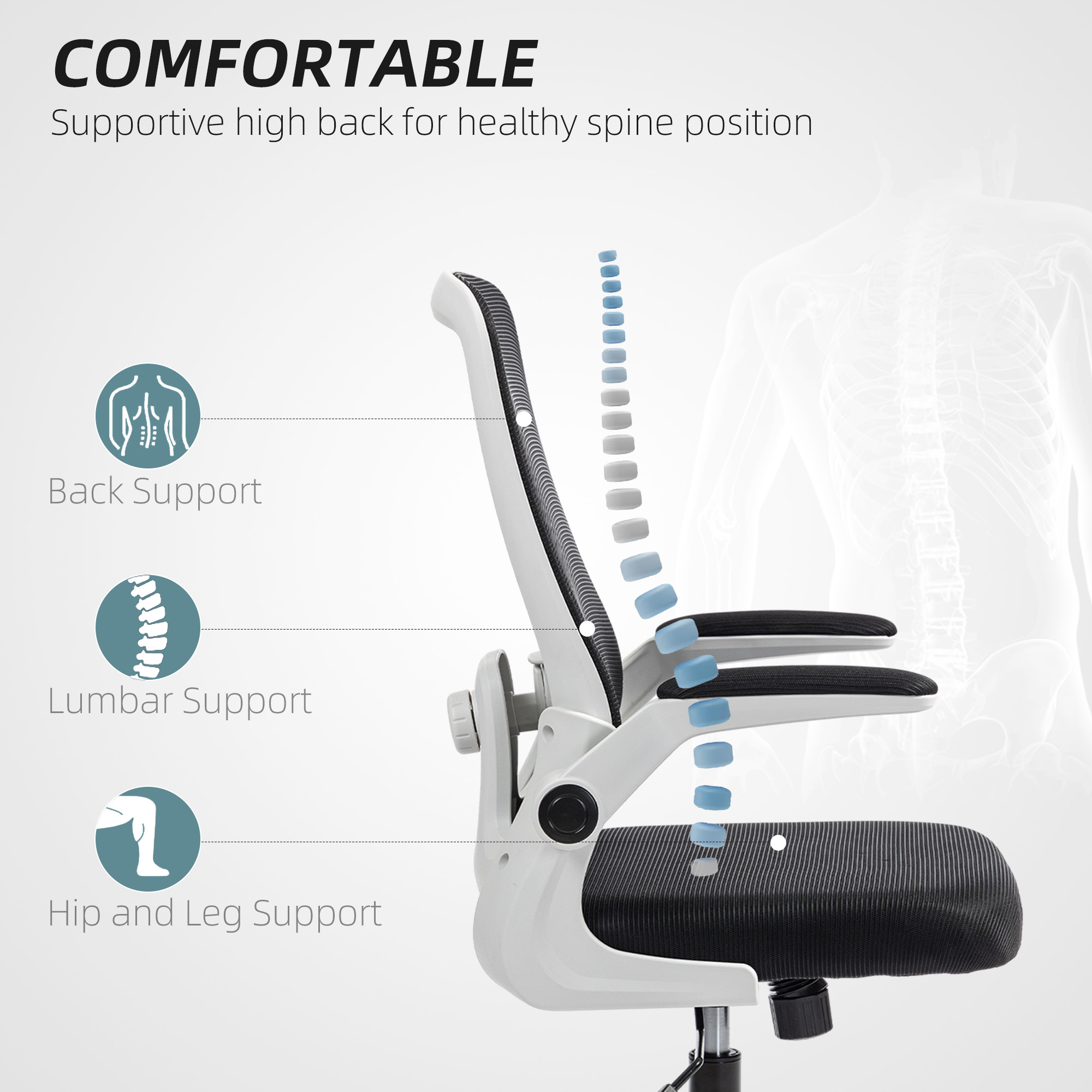 - Flip-up armrests to fit chair under a table easily