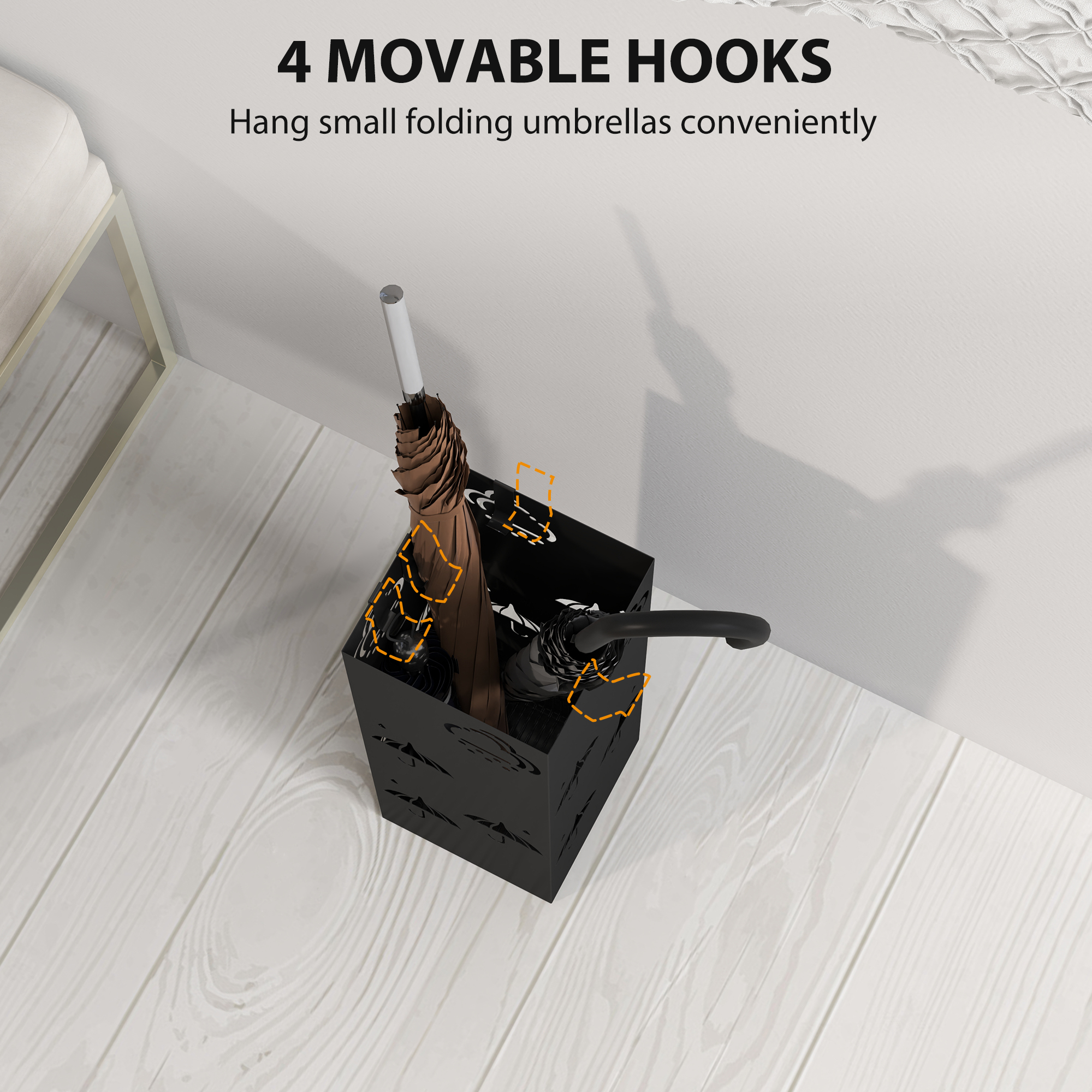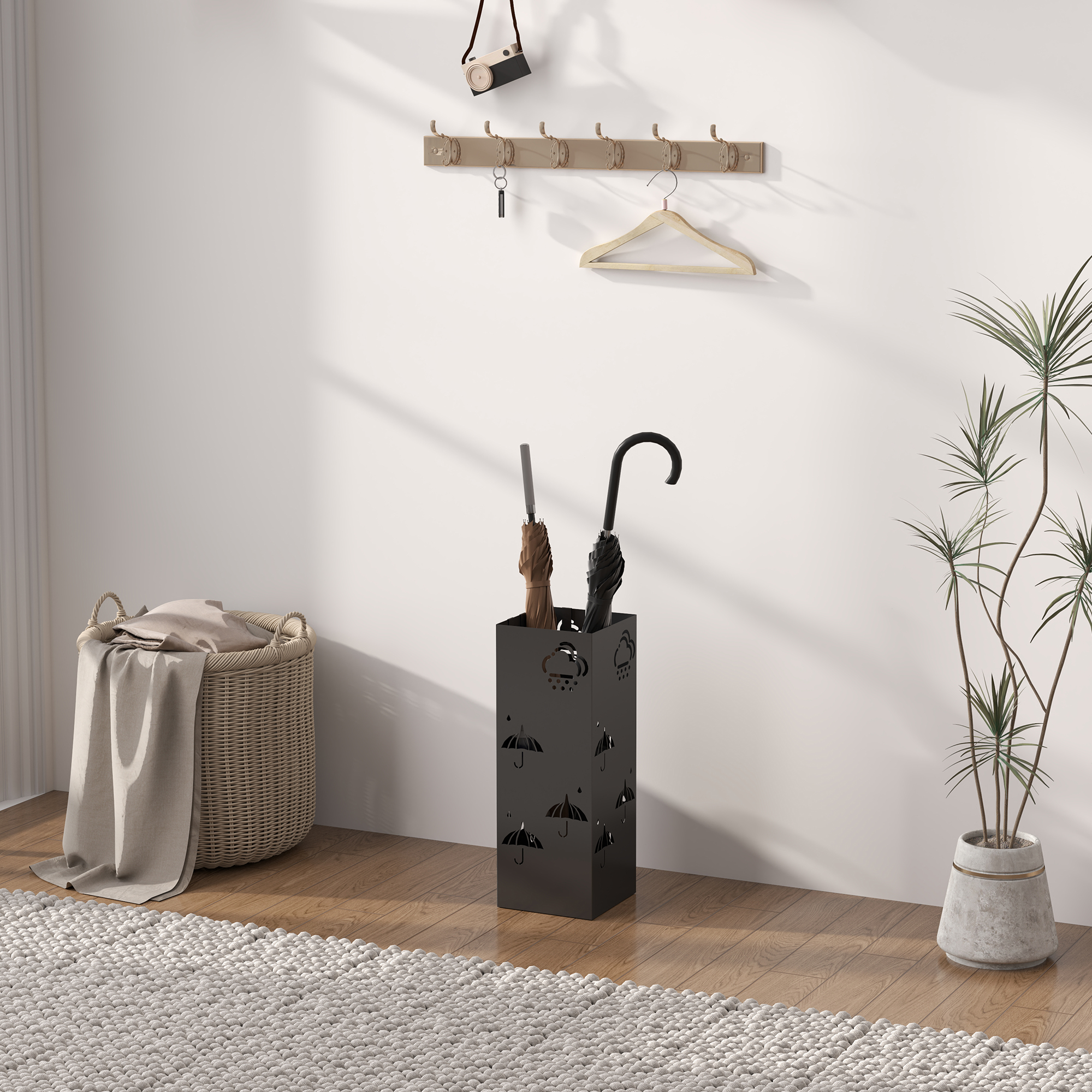 Keep your floors dry and your entryway stylish with the umbrella stand from HOMCOM. Designed to catch every drop with its removable drip tray, it keeps your home spotless while offering lots of storage for long umbrellas and convenient hooks for folding ones. Featuring charming rain-themed cutouts, this HOMCOM umbrella stand creates an artful appearance that brightens up your hallway