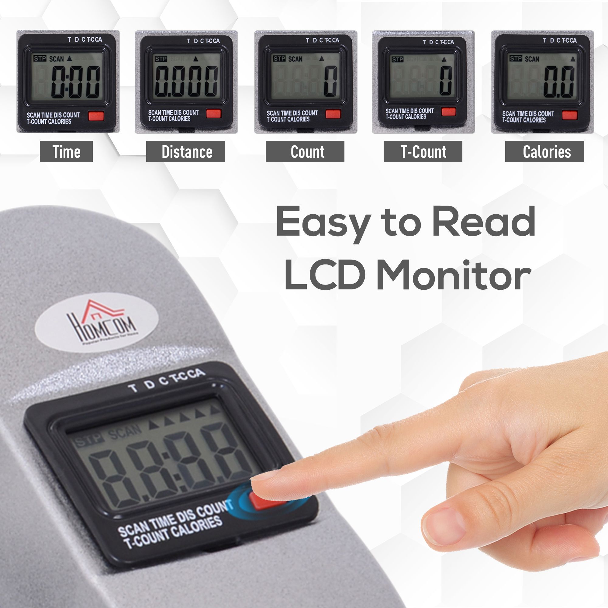 - LCD monitor clearly displays the time, speed, count, total count and calories burnt. 1 x AAA battery is required