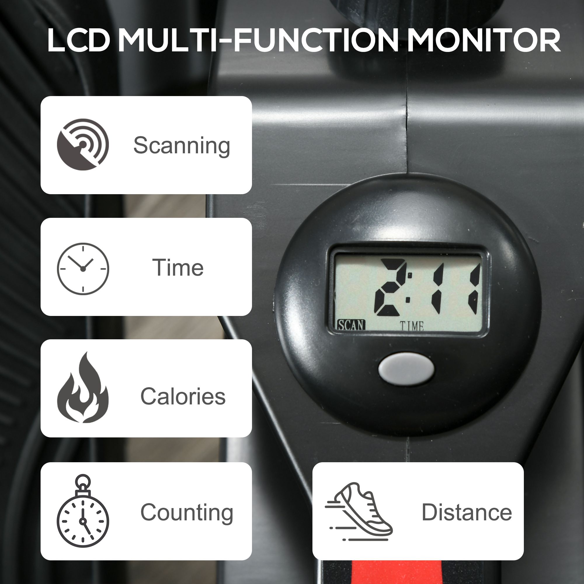 - LCD screen displays the time elapsed, distance pedaled and calories burnt