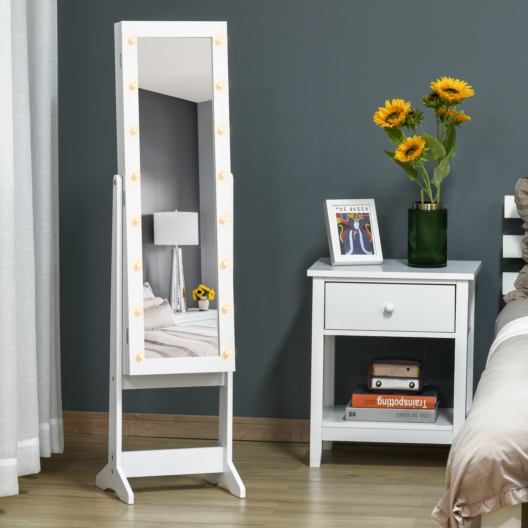 This floor standing jewellery cabinet from HOMCOM is perfect for keeping all your make-up, jewellery and other accessories together in a place. On the outside is a full-length mirror with battery powered LED lights that create a soft and flattering glow, and on the inside is a fully-lined interior that can house up to 32 pairs of earrings, 70 rings, 12 hooks and three shelves. Made from sturdy MDF board, the mirror can be adjusted to three different levels to suit your preferences. Clean, stylish and contemporary, this organiser is a beautiful addition to any style surrounding.