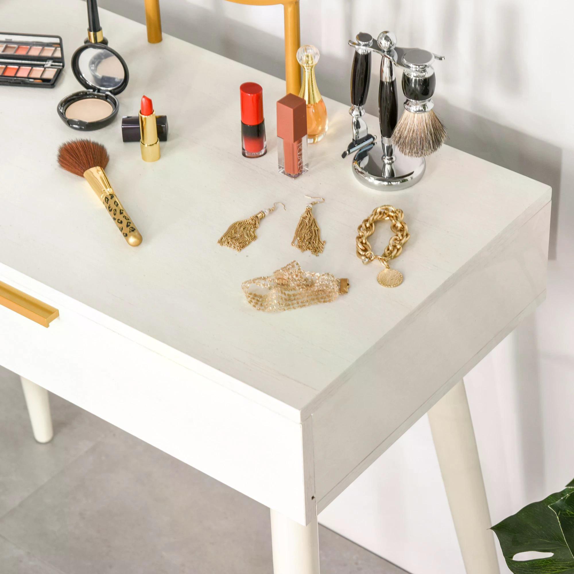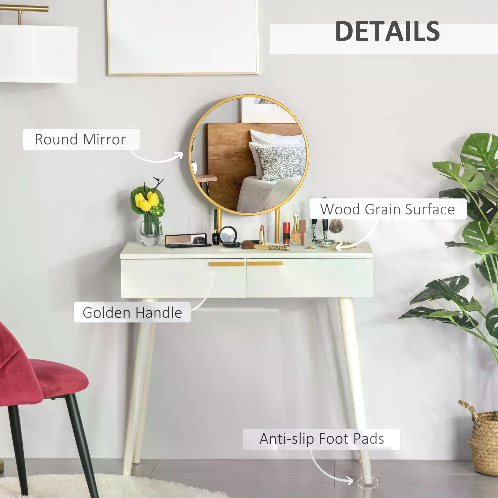 You will find everything you need in this HOMCOM dressing table: elegance, storage and comfort. Two sliding drawers for easy storage of cosmetics, brushes and other products. The table top is flat and large for extra holding room, with a large round mirror for you to get ready. The space beneath the table provides plenty of room for your legs, so you never feel cramped.