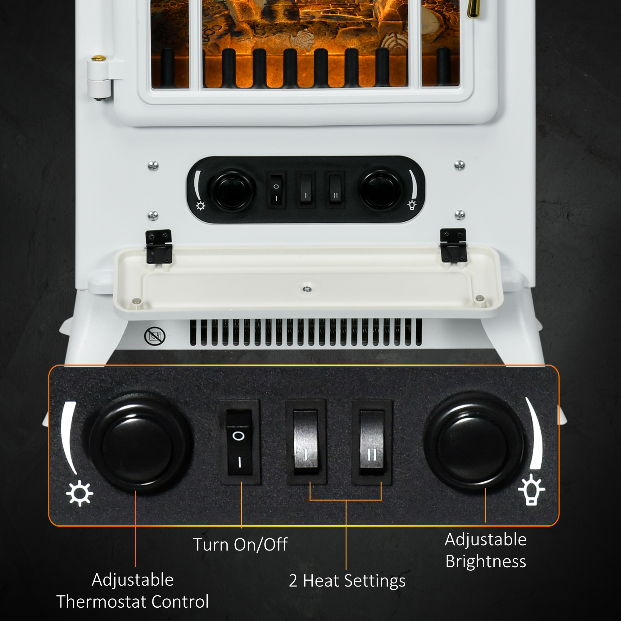 - Flame and wood burning effect, which can be used with heat on and off. Adjustable brightness control