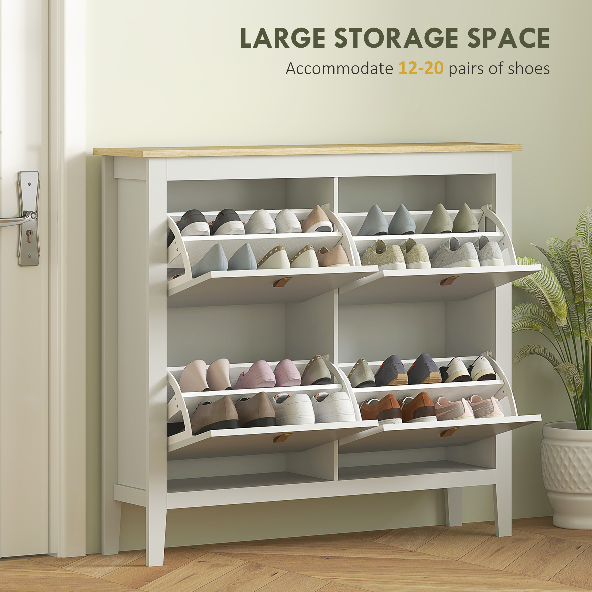 Effortlessly beautiful home storage comes in the form of this HOMCOM slim shoe storage cabinet. A modern boxy shape, in a touch of colour, this narrow shoe cabinet brings in a gentle touch of character into your space. With four flip drawers, it can hold 20x shoe pairs, maximum size uk mens 9.5. All drawers have a two-level adjustable shelf, allowing you to fit in all kinds of footwear. Comes with an anti-tipping kit to securely fix to a wall.