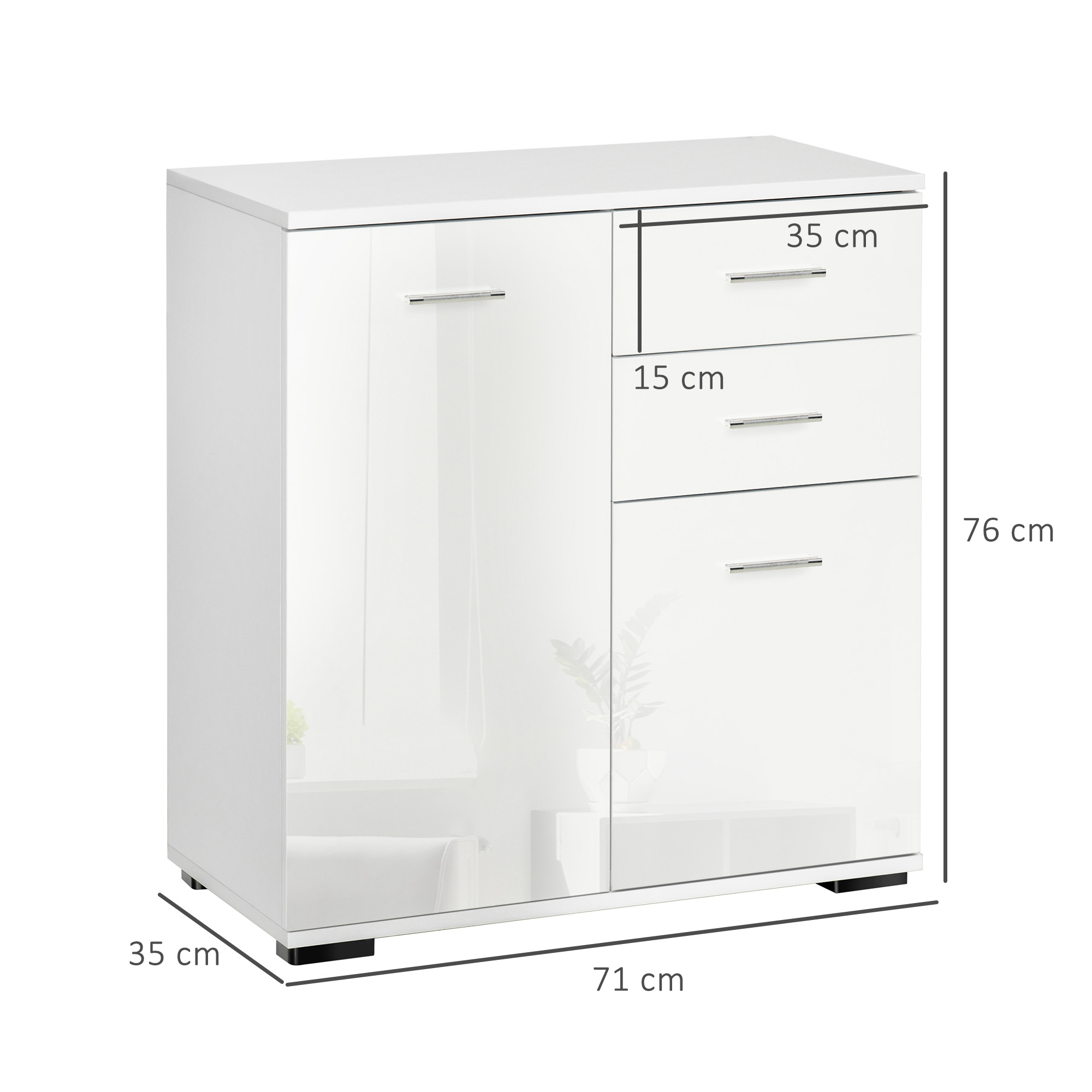 Decluttering made modern with this HOMCOM sideboard. A clean white design for a modern look, making it suitable for plenty of living and dining spaces. It comes with two drawers, two cupboard, as well as a flat top: plenty of room for holding tableware, silverware, small appliances and more. The large cupboard features a five-level adjustable shelf to fit in differently-sized items. Complete with anti-tipping straps to attach to a wall safely.