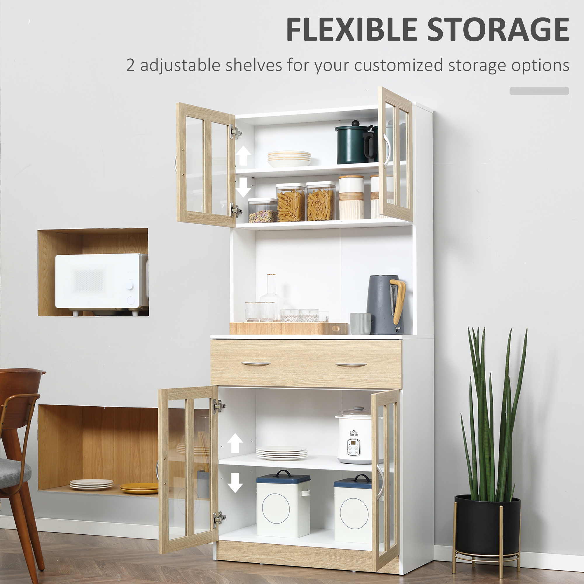Kitchen space made easy with this freestanding hutch-style kitchen cabinet from HOMCOM. Crafted from particle board so it's tough, with a veneered surface for a smooth and beautiful finish. Formed of an upper and lower cabinet, flat middle shelf and drawer, there's plenty of room to hold small appliances, crockery, tins and packets. The white and wood-effect design of the kitchen dresser is classic, a piece perfect for loads of different home/office styles.