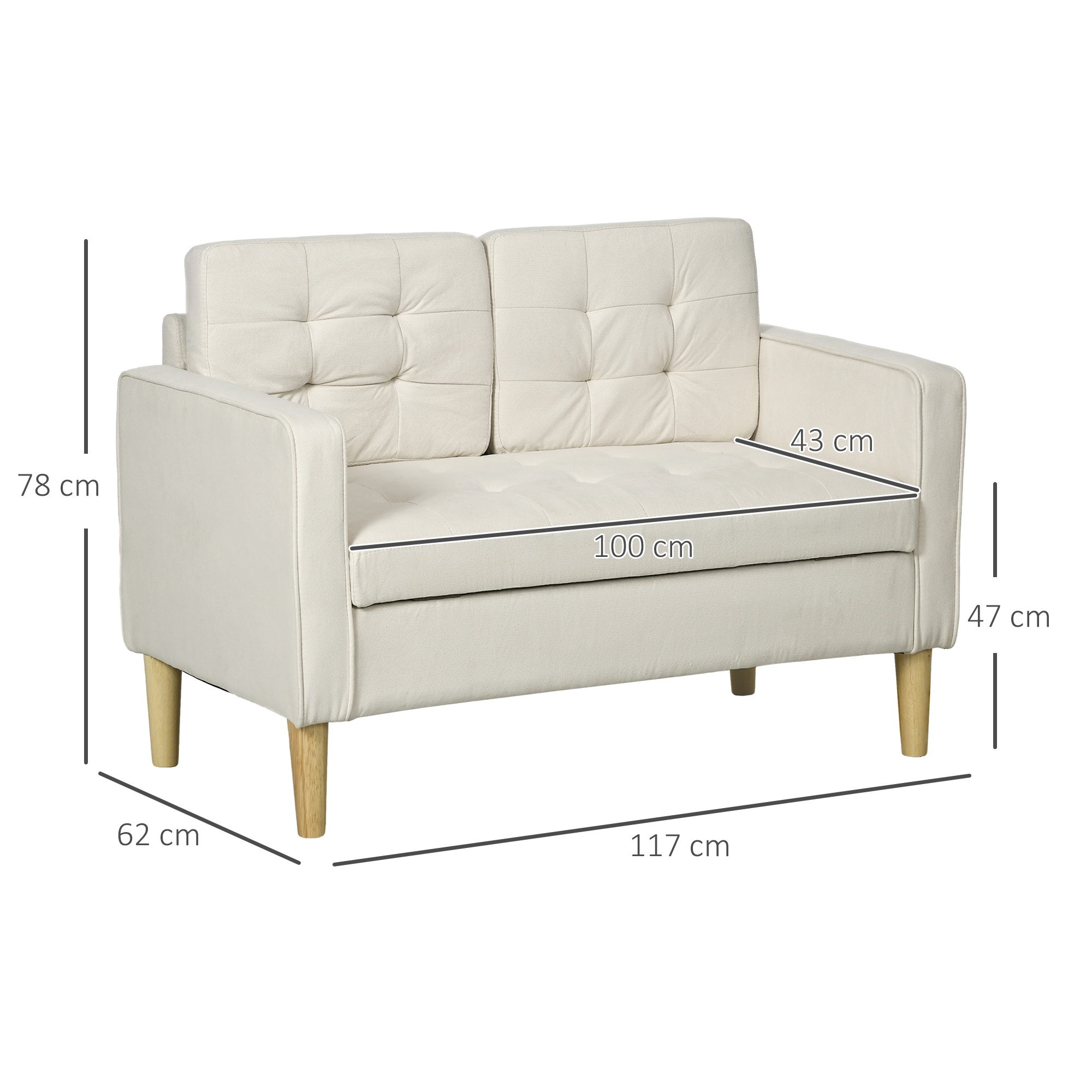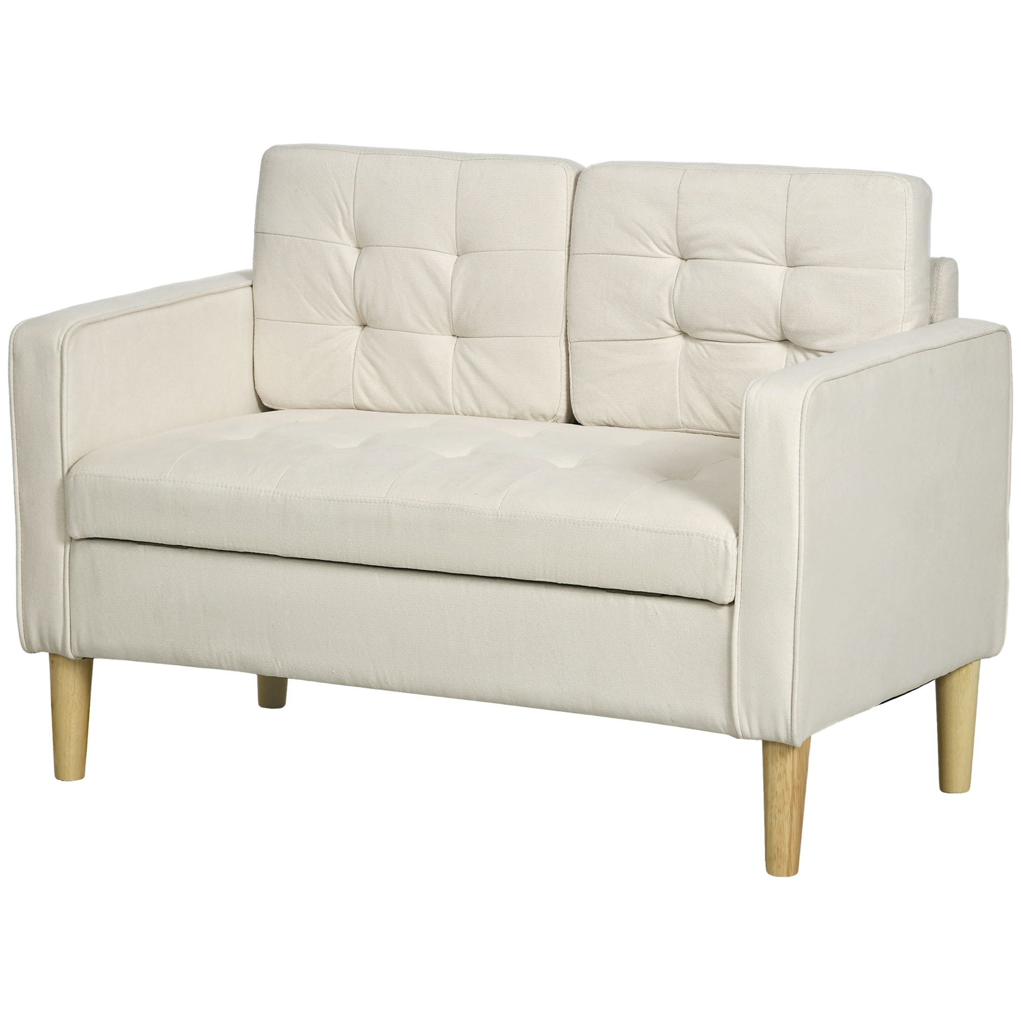 Experience comfort and handiness with this HOMCOM two-seater sofa with storage. Sponge filling and cotton-blend polyester makes it a piece to sink into. Inside storage for keeping small items tucked away out of sight. The wooden frame and legs ensure strong support. A simple piece, suitable for every home.