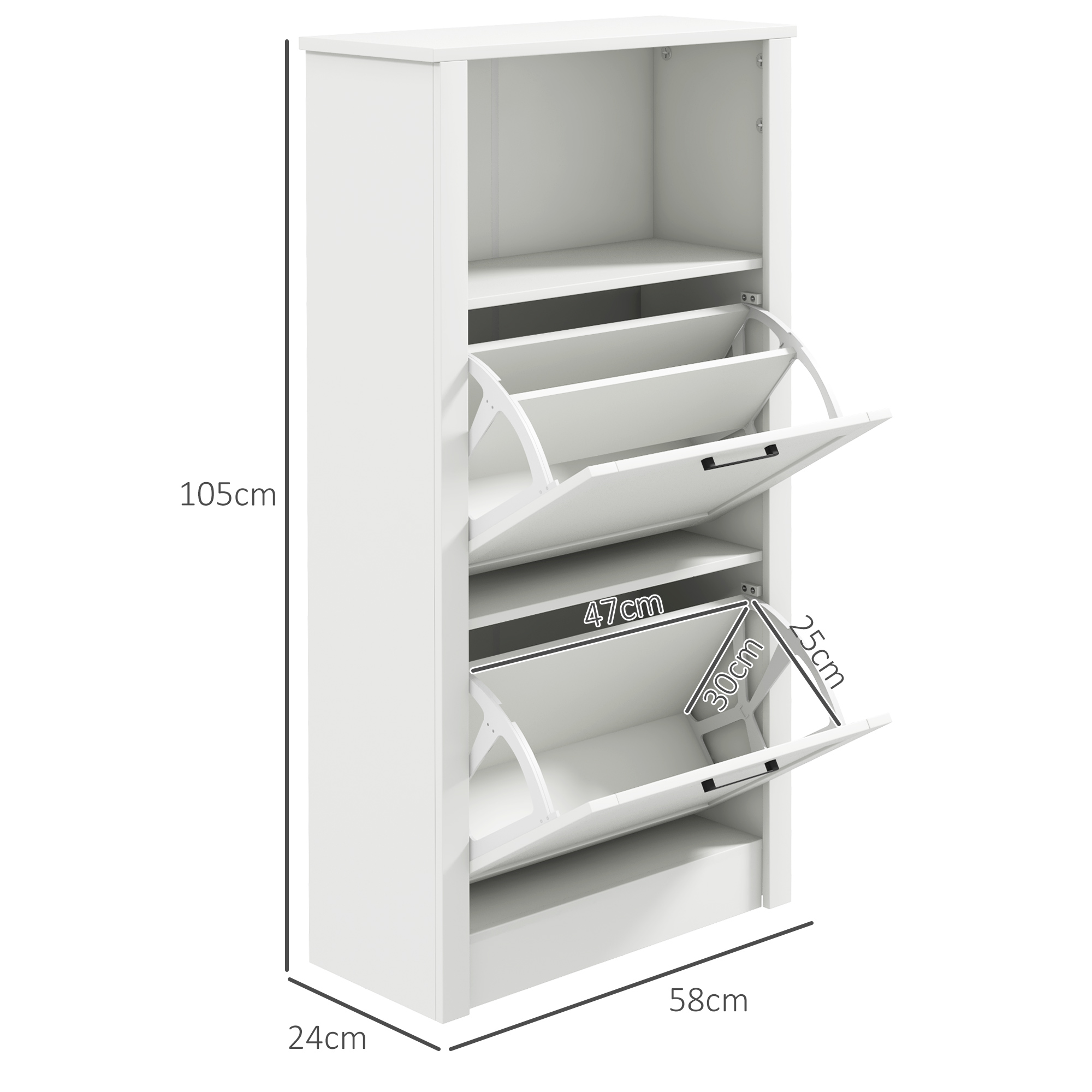 A shoe cabinet is an indispensable piece of furniture. The slim shoe storage cabinet from HOMCOM lets you organise your shoes and belongings even in a small space. The two-tier flip drawers provide a large storage capacity for shoes. You can remove its shelves to accommodate ankle boots and tall high heels. Its open shelf and countertop let you store and display your keys, photo albums and plants. Don't trip over your family's shoes; make organisation easy with a shoe storage unit from HOMCOM.