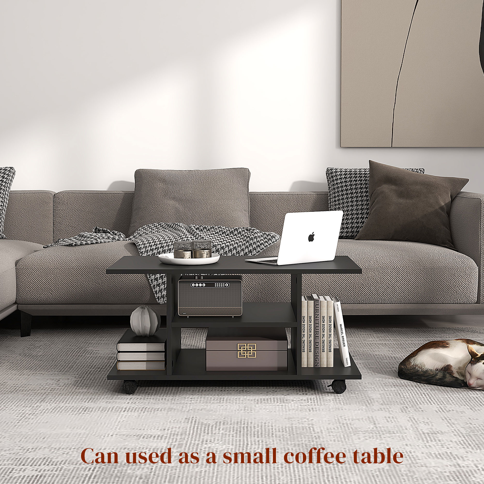 This stylish TV unit is a suitable option for living room furniture. Featuring a stand top and a two-layer open shelf, it provides more space for your other stuff. Four 360° castor wheels under the entertainment unit enable you to move it with ease to wherever you'd like. They also complete with brakes, so the table can be kept static in a certain place.