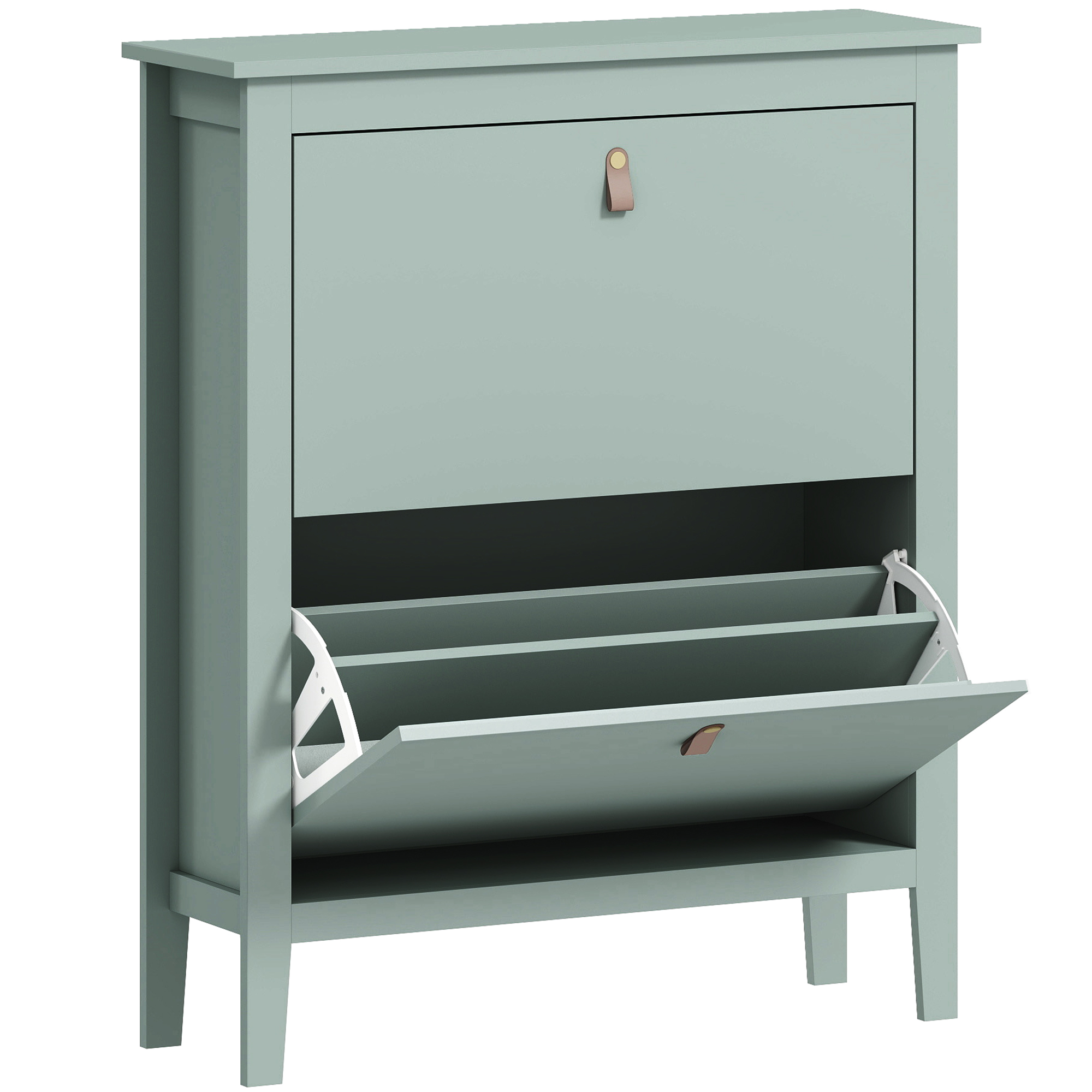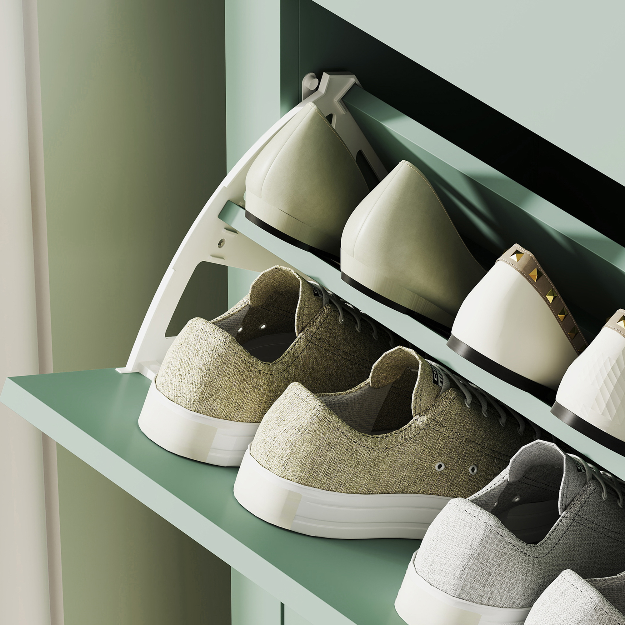 - Two flip drawers store up to 14 shoe pairs