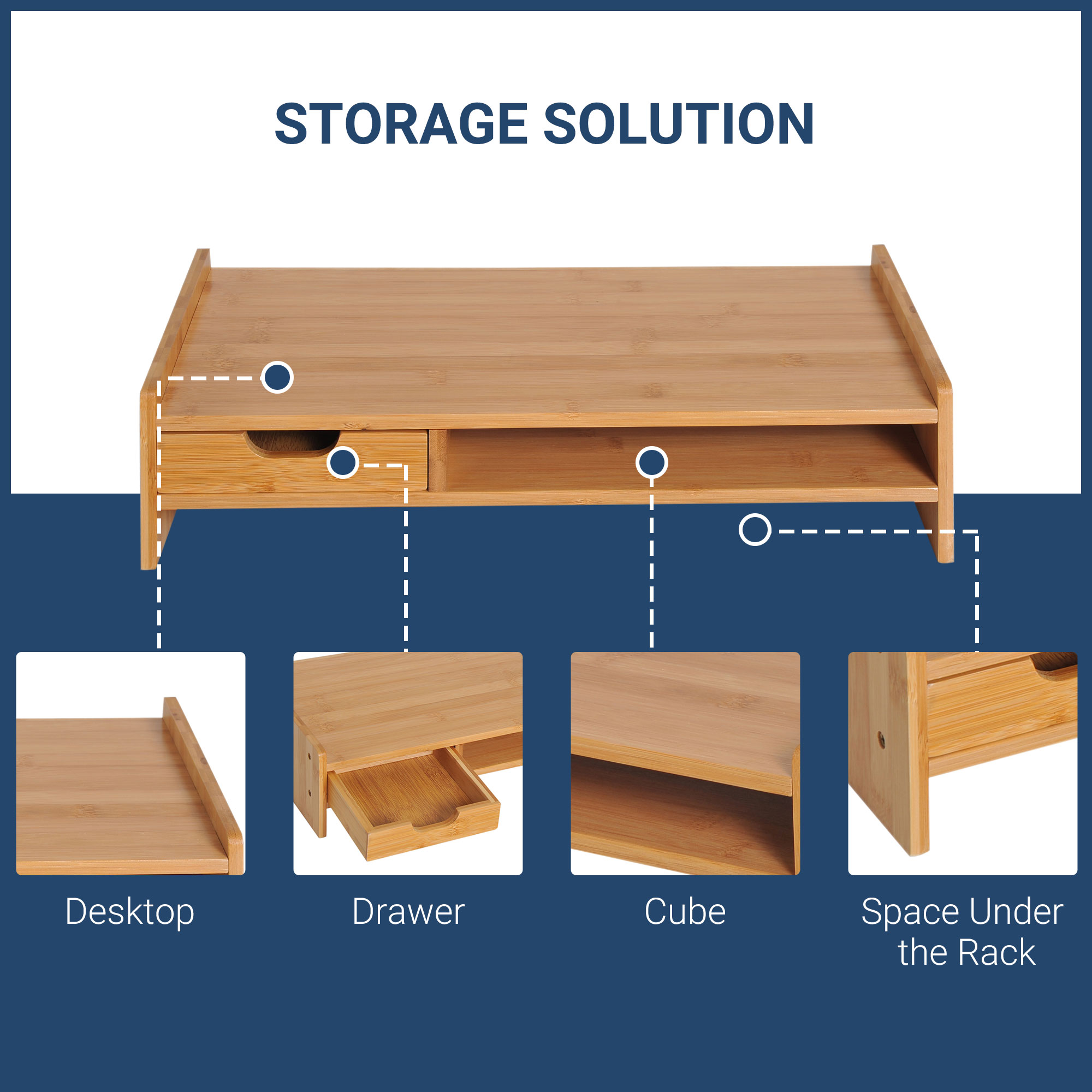 This desktop monitor stand from HOMOCM is a simple and economical addition to your office. Perfect to fit Mac mini, laptop, printer, raises monitor to a comfortable viewing height while maximizing work space, and reduces eye strain and neck and back pain. A drawer and a storage cube included to keep staplers, clips and other office supplies and a storage space under the rack for the keyboard and mouse. Get your healthier and efficient life starts with this perfect stand from HOMCOM!