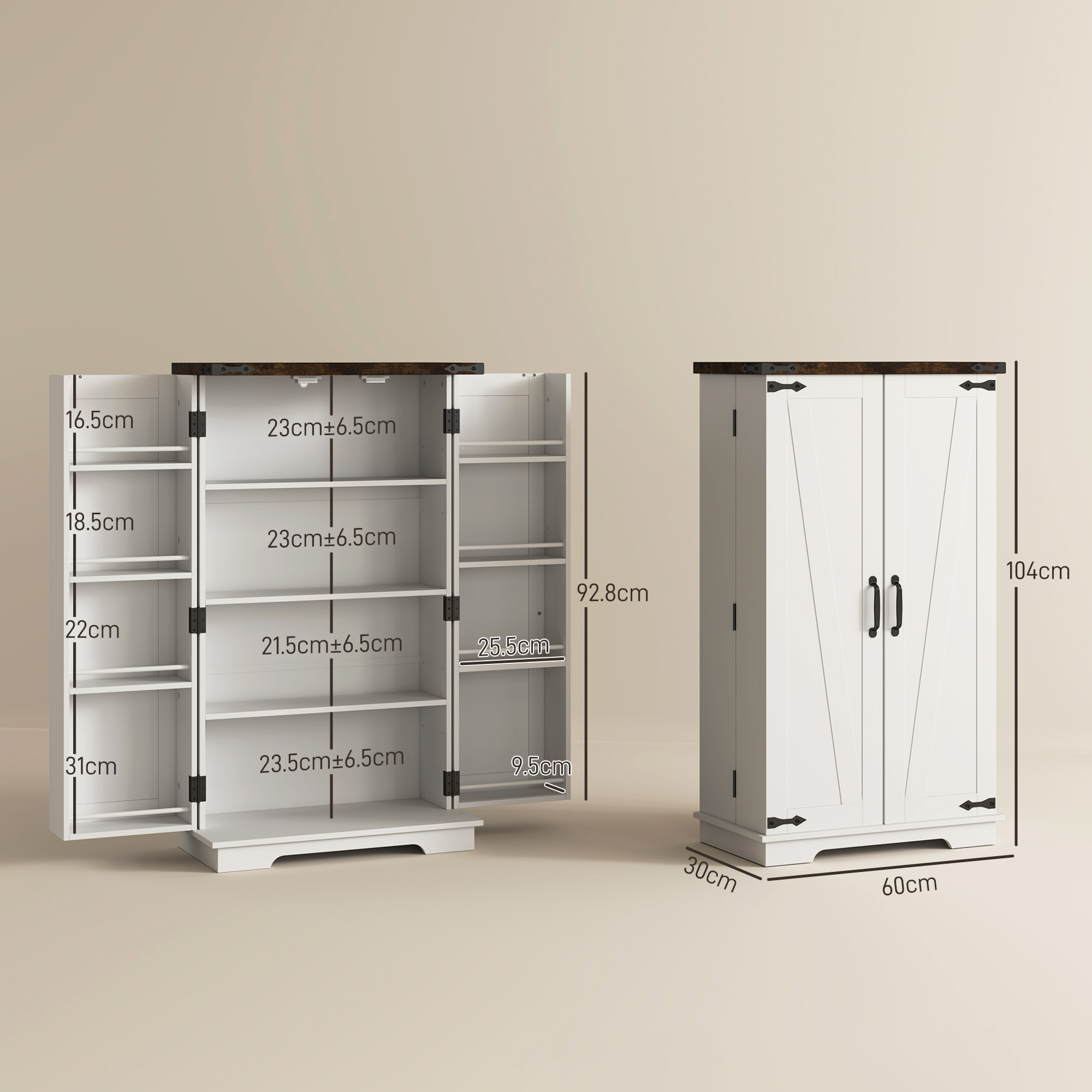 Simple, beautiful style for your kitchen, with plenty of space: this HOMCOM farmhouse kitchen cabinet. It comes with four middle shelves, plus four shelves on both doors - keep plenty of food, tableware and accessories together in one place. Middle comes with two three-level adjustable shelves to fit smaller/larger items as needed. Complete with magnetic-close doors and comes with anti-tipping straps for safety.