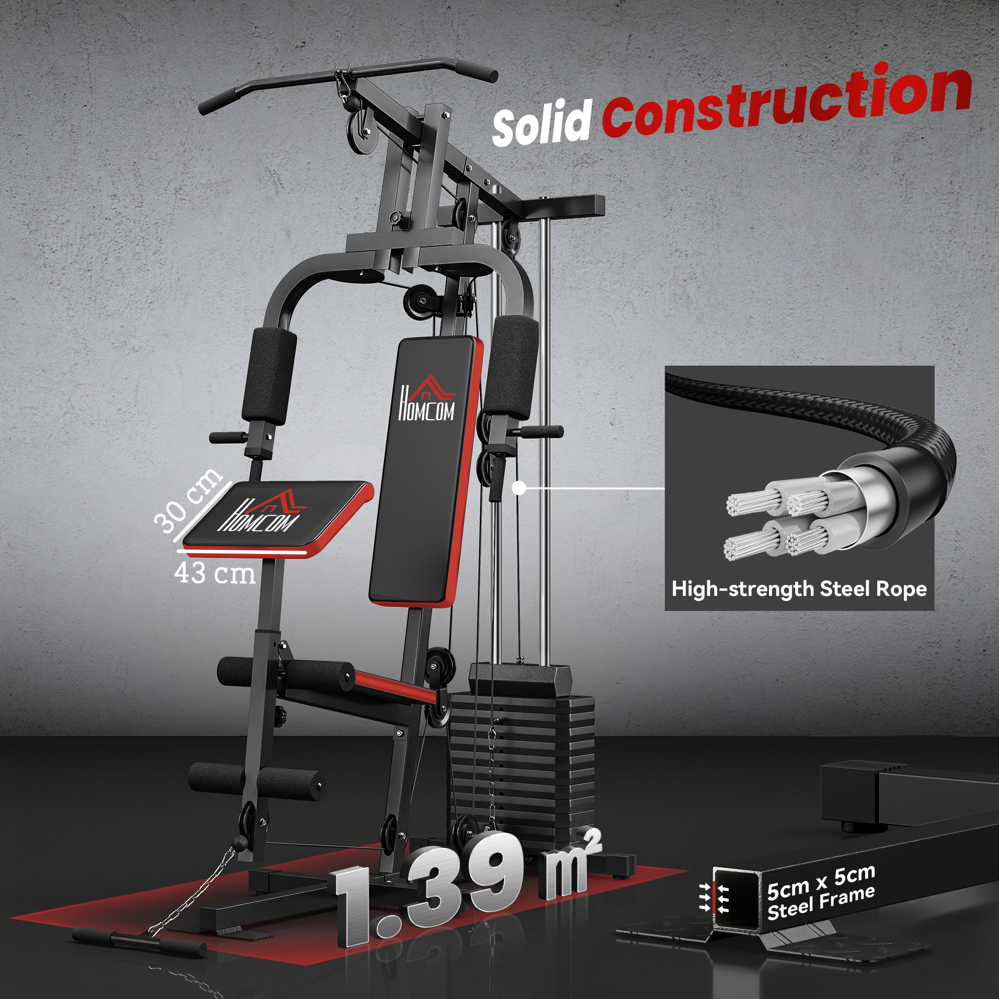 Keep fit with this HOMCOM multigym station. With this home training equipment, you can do lats pulldown, pec fly, chest press, leg curls and leg extensions, ensuring you get a full body workout and build strength. Sitting on a thick padded seat and backrest, you'll be comfortable as you break a sweat. Its solid steel frame keeps the station in shape when in use, whilst the non-slip footpads keep the station balanced and steady. You'll have your very own gym, taking weight training to the next level.