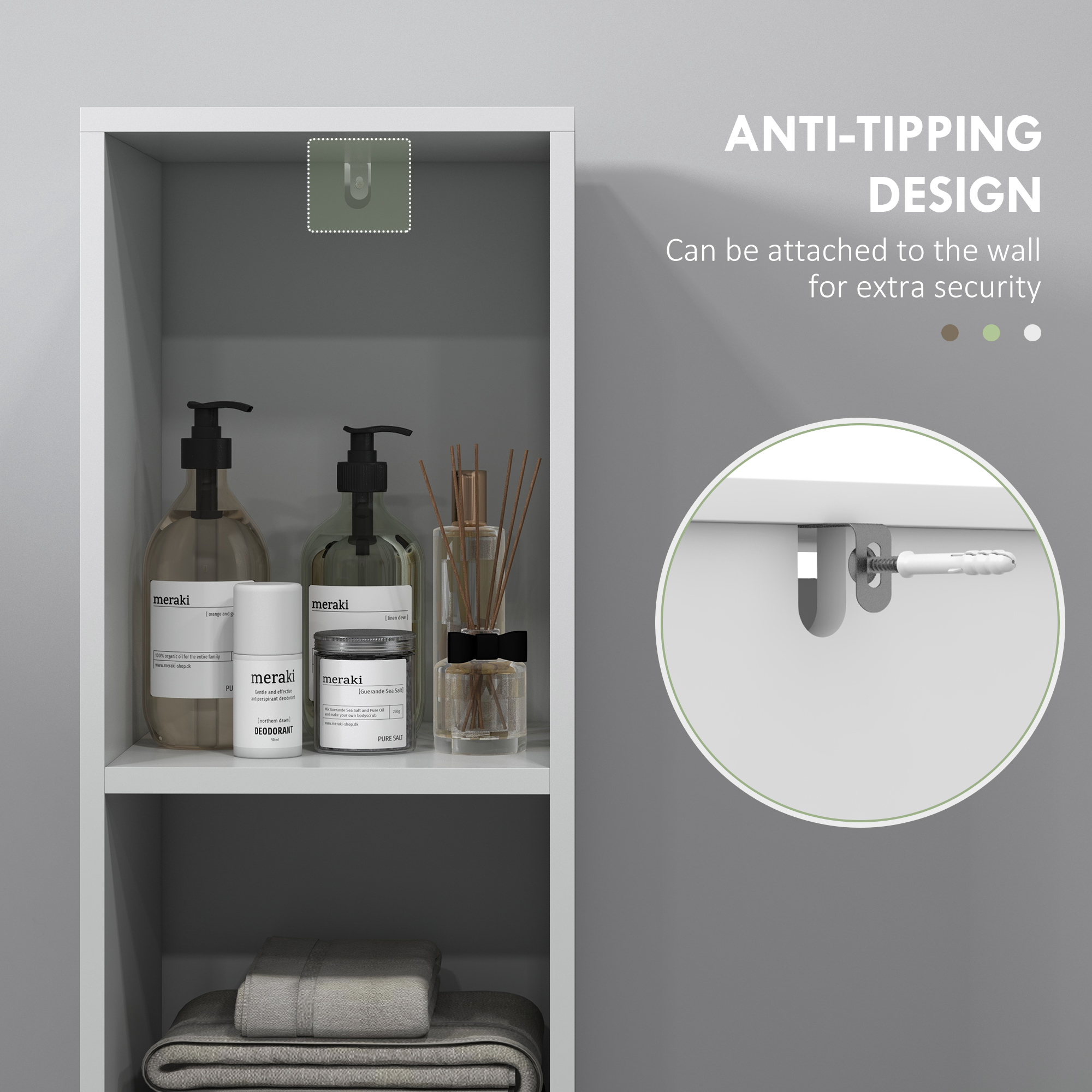 Discover the charm of optimised space with the HOMCOM bathroom storage cabinet. This sleek bathroom unit features two open compartments and a private cabinet with an inner shelf, great for tidying up your toiletries. Its tall and slim design fits snugly into any nook, while the anti-tipping feature and elevated base ensure stability and ease of cleaning underneath. A stylish addition to any bathroom!