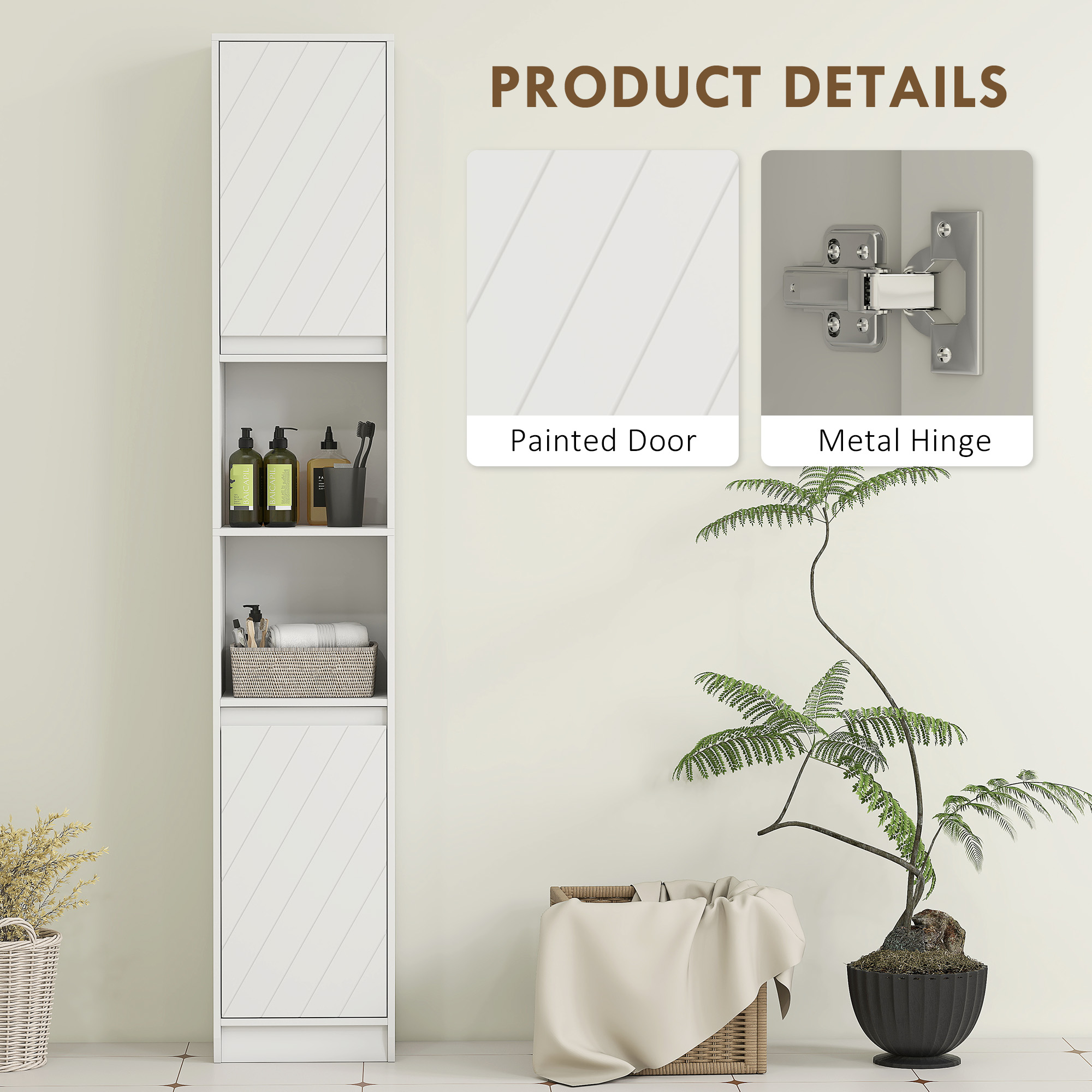Maximise space and reduce clutter with this retro-style slim bathroom storage cabinet from HOMCOM. Made from solid MDF and particle board, it fits easily into tight spaces and offers two cupboards and two open compartments for towels, toiletries and more. Includes anti-tipping straps for added safety.