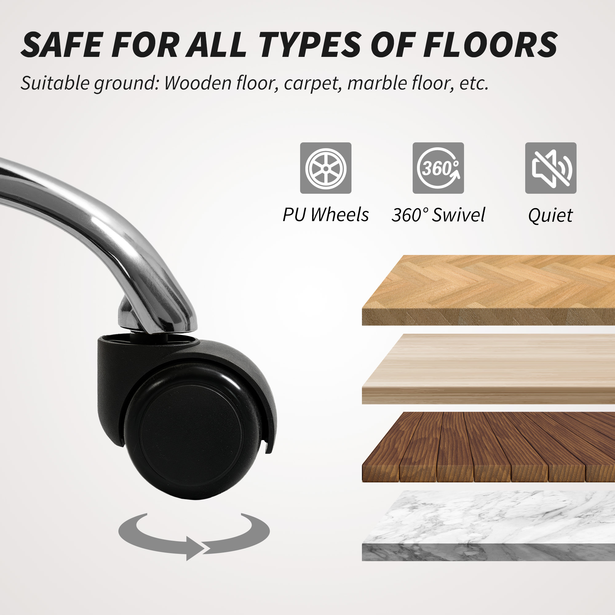 - 360° swivel seat and PU wheels allow easy movement on various flooring types