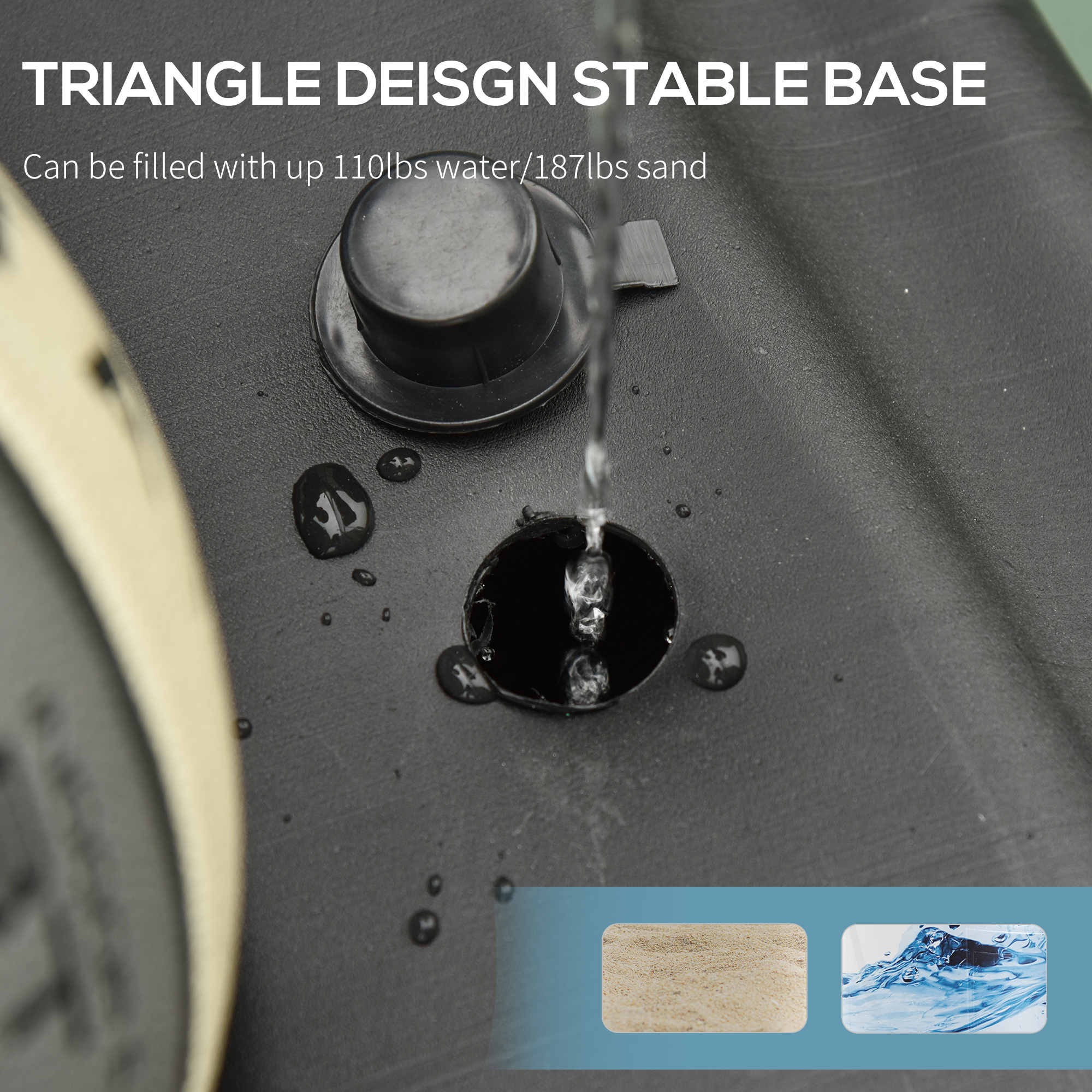 - Thick plastic base is tough, fills with a maximum 50kg water or 85kg sand