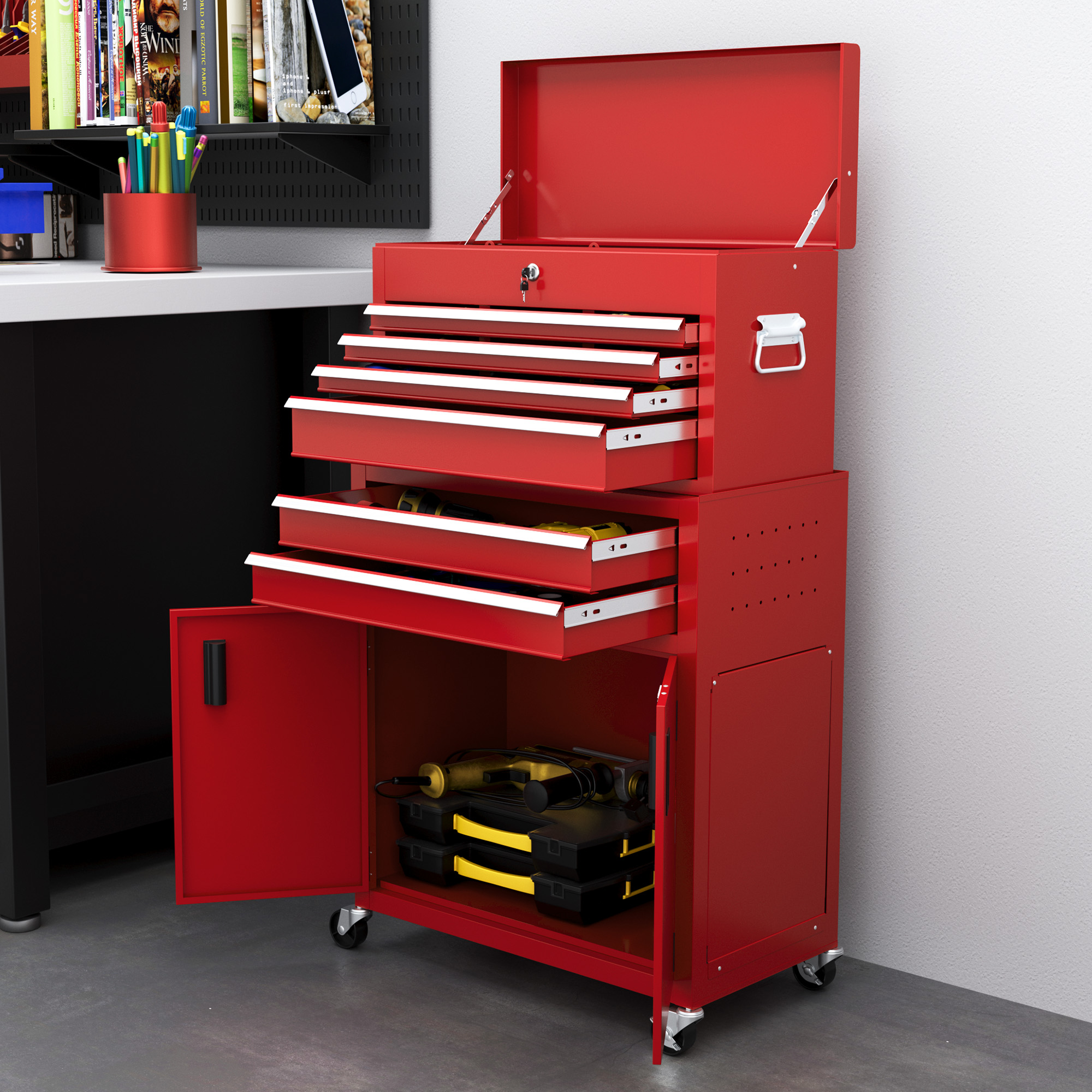 - The tool chest and cabinet can be used separately or together
